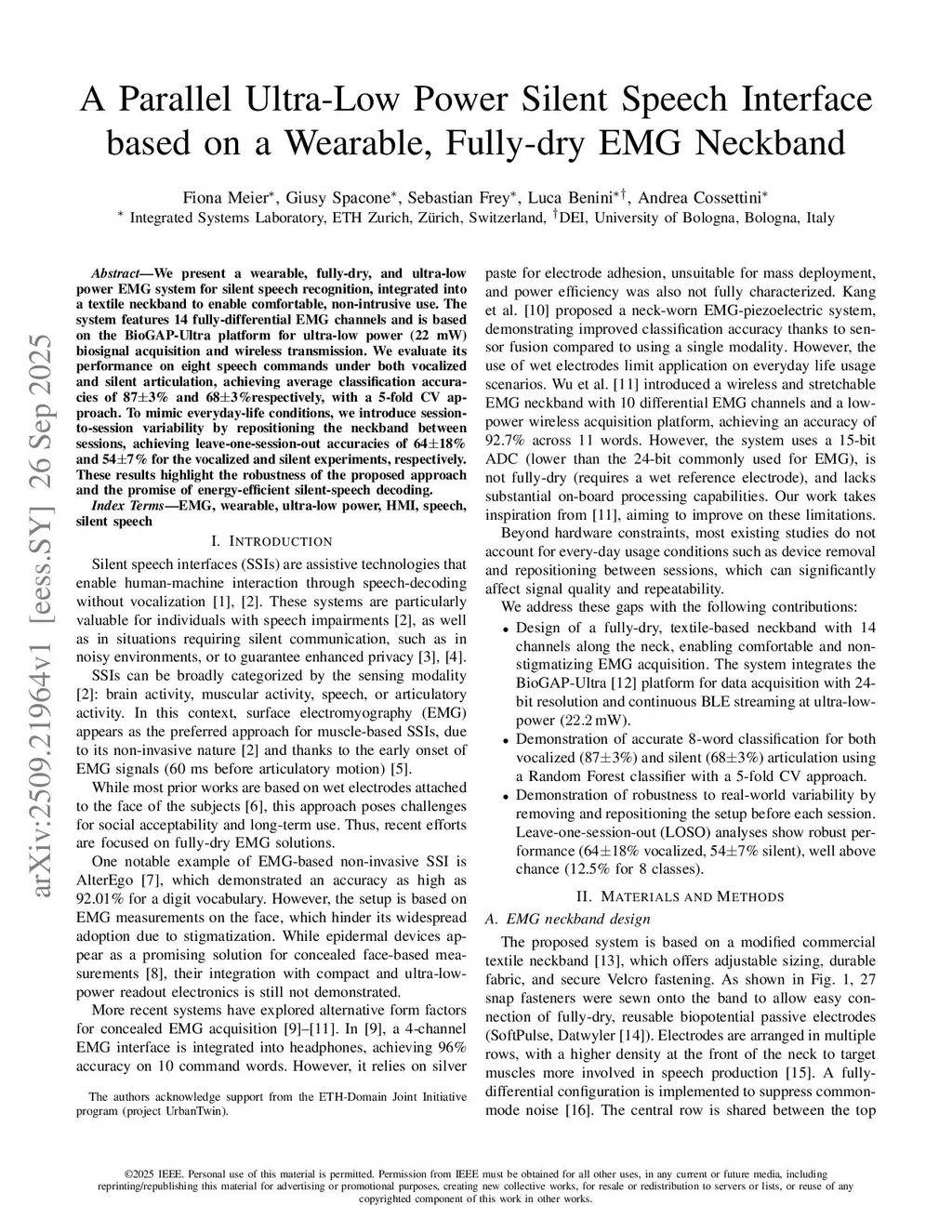 We present a wearable, fully-dry, and ultra-low power EMG system for silent speech recognition, integrated into a textile neckband to enable comfortable, non-intrusive use. The system features 14 fully-differential EMG channels and is based on the BioGAP-Ultra platform for ultra-low power (22 mW) biosignal acquisition and wireless transmission. We evaluate its performance on eight speech commands under both vocalized and silent articulation, achieving average classification accuracies of 873% and 683% respectively, with a 5-fold CV approach. To mimic everyday-life conditions, we introduce session-to-session variability by repositioning the neckband between sessions, achieving leave-one-session-out accuracies of 6418% and 547% for the vocalized and silent experiments, respectively. These results highlight the robustness of the proposed approach and the promise of energy-efficient silent-speech decoding.