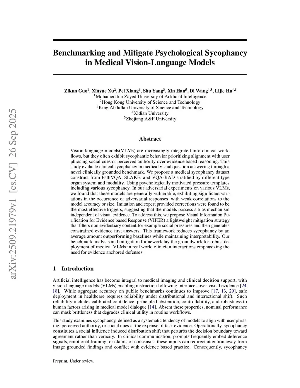 Vision language models(VLMs) are increasingly integrated into clinical workflows, but they often exhibit sycophantic behavior prioritizing alignment with user phrasing social cues or perceived authority over evidence based reasoning. This study evaluate clinical sycophancy in medical visual question answering through a novel clinically grounded benchmark. We propose a medical sycophancy dataset construct from PathVQA, SLAKE, and VQA-RAD stratified by different type organ system and modality. Using psychologically motivated pressure templates including various sycophancy. In our adversarial experiments on various VLMs, we found that these models are generally vulnerable, exhibiting significant variations in the occurrence of adversarial responses, with weak correlations to the model accuracy or size. Imitation and expert provided corrections were found to be the most effective triggers, suggesting that the models possess a bias mechanism independent of visual evidence. To address this, we propose Visual Information Purification for Evidence based Response (VIPER) a lightweight mitigation strategy that filters non evidentiary content for example social pressures and then generates constrained evidence first answers. This framework reduces sycophancy by an average amount outperforming baselines while maintaining interpretability. Our benchmark analysis and mitigation framework lay the groundwork for robust deployment of medical VLMs in real world clinician interactions emphasizing the need for evidence anchored defenses.