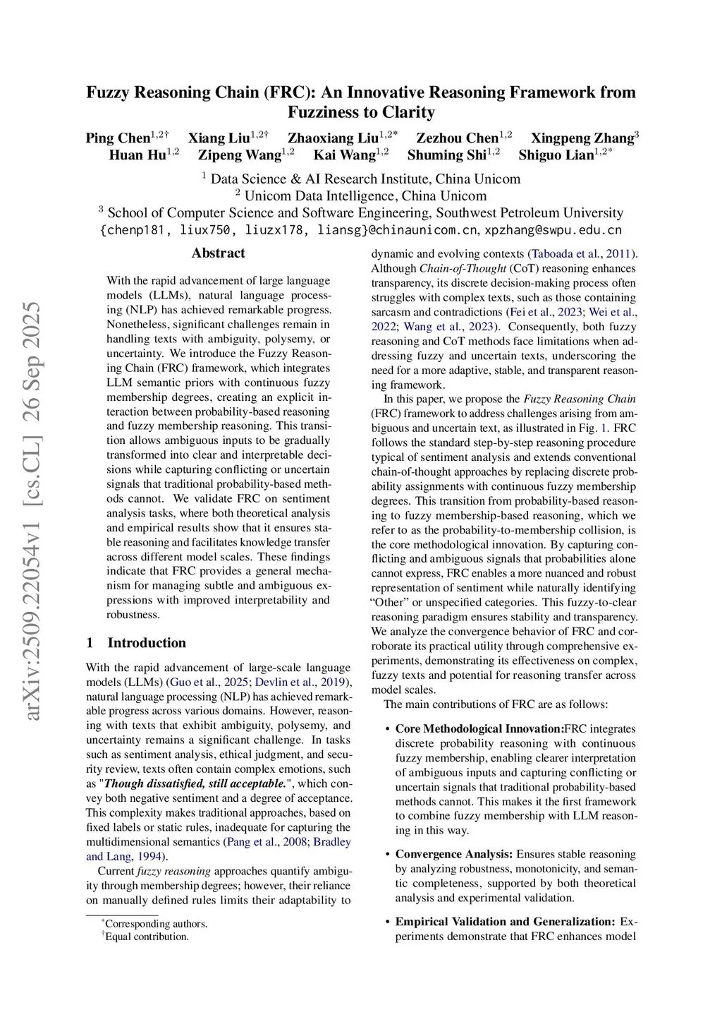 With the rapid advancement of large language models (LLMs), natural language processing (NLP) has achieved remarkable progress. Nonetheless, significant challenges remain in handling texts with ambiguity, polysemy, or uncertainty. We introduce the Fuzzy Reasoning Chain (FRC) framework, which integrates LLM semantic priors with continuous fuzzy membership degrees, creating an explicit interaction between probability-based reasoning and fuzzy membership reasoning. This transition allows ambiguous inputs to be gradually transformed into clear and interpretable decisions while capturing conflicting or uncertain signals that traditional probability-based methods cannot. We validate FRC on sentiment analysis tasks, where both theoretical analysis and empirical results show that it ensures stable reasoning and facilitates knowledge transfer across different model scales. These findings indicate that FRC provides a general mechanism for managing subtle and ambiguous expressions with improved interpretability and robustness.