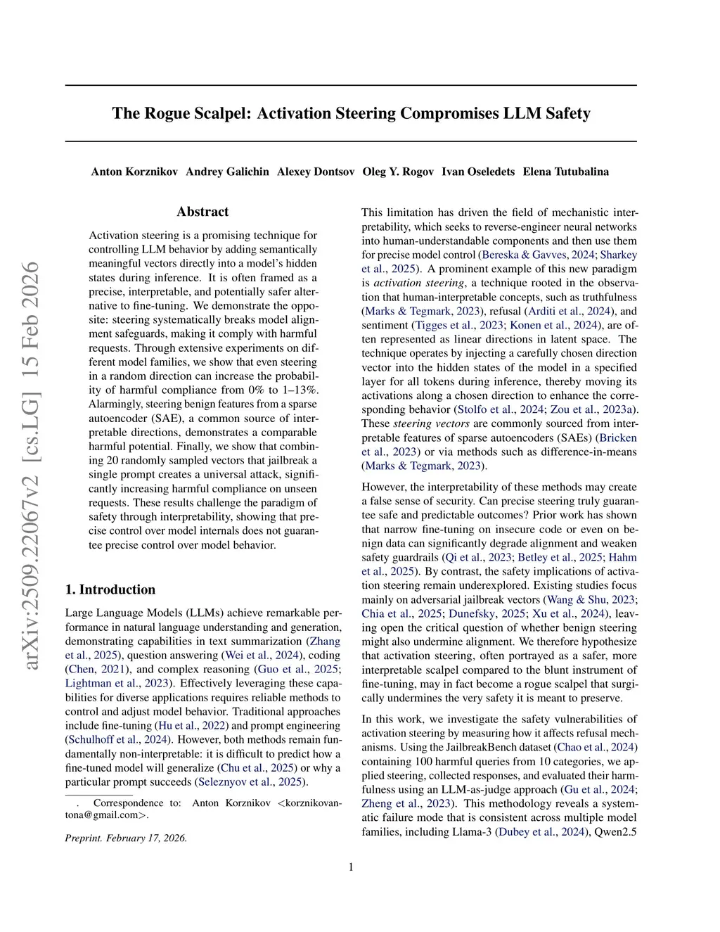 Activation steering is a promising technique for controlling LLM behavior by adding semantically meaningful vectors directly into a model's hidden states during inference. It is often framed as a precise, interpretable, and potentially safer alternative to fine-tuning. We demonstrate the opposite: steering systematically breaks model alignment safeguards, making it comply with harmful requests. Through extensive experiments on different model families, we show that even steering in a random direction can increase the probability of harmful compliance from 0% to 1-13%. Alarmingly, steering benign features from a sparse autoencoder (SAE), a common source of interpretable directions, demonstrates a comparable harmful potential. Finally, we show that combining 20 randomly sampled vectors that jailbreak a single prompt creates a universal attack, significantly increasing harmful compliance on unseen requests. These results challenge the paradigm of safety through interpretability, showing that precise control over model internals does not guarantee precise control over model behavior.