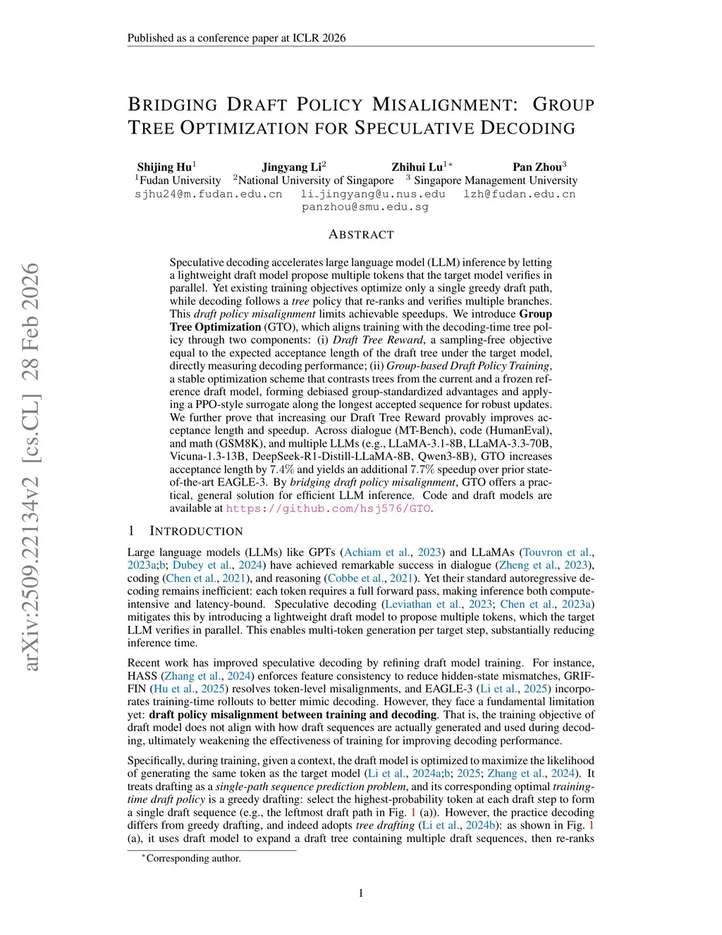Speculative decoding accelerates large language model (LLM) inference by letting a lightweight draft model propose multiple tokens that the target model verifies in parallel. Yet existing training objectives optimize only a single greedy draft path, while decoding follows a tree policy that re-ranks and verifies multiple branches. This draft policy misalignment limits achievable speedups. We introduce Group Tree Optimization (GTO), which aligns training with the decoding-time tree policy through two components: (i) Draft Tree Reward, a sampling-free objective equal to the expected acceptance length of the draft tree under the target model, directly measuring decoding performance; (ii) Group-based Draft Policy Training, a stable optimization scheme that contrasts trees from the current and a frozen reference draft model, forming debiased group-standardized advantages and applying a PPO-style surrogate along the longest accepted sequence for robust updates. We further prove that increasing our Draft Tree Reward provably improves acceptance length and speedup. Across dialogue (MT-Bench), code (HumanEval), and math (GSM8K), and multiple LLMs (e.g., LLaMA-3.1-8B, LLaMA-3.3-70B, Vicuna-1.3-13B, DeepSeek-R1-Distill-LLaMA-8B, Qwen3-8B), GTO increases acceptance length by (7.4%) and yields an additional (7.7%) speedup over prior state-of-the-art EAGLE-3. By bridging draft policy misalignment, GTO offers a practical, general solution for efficient LLM inference. Code and draft models are available atthis https URL.