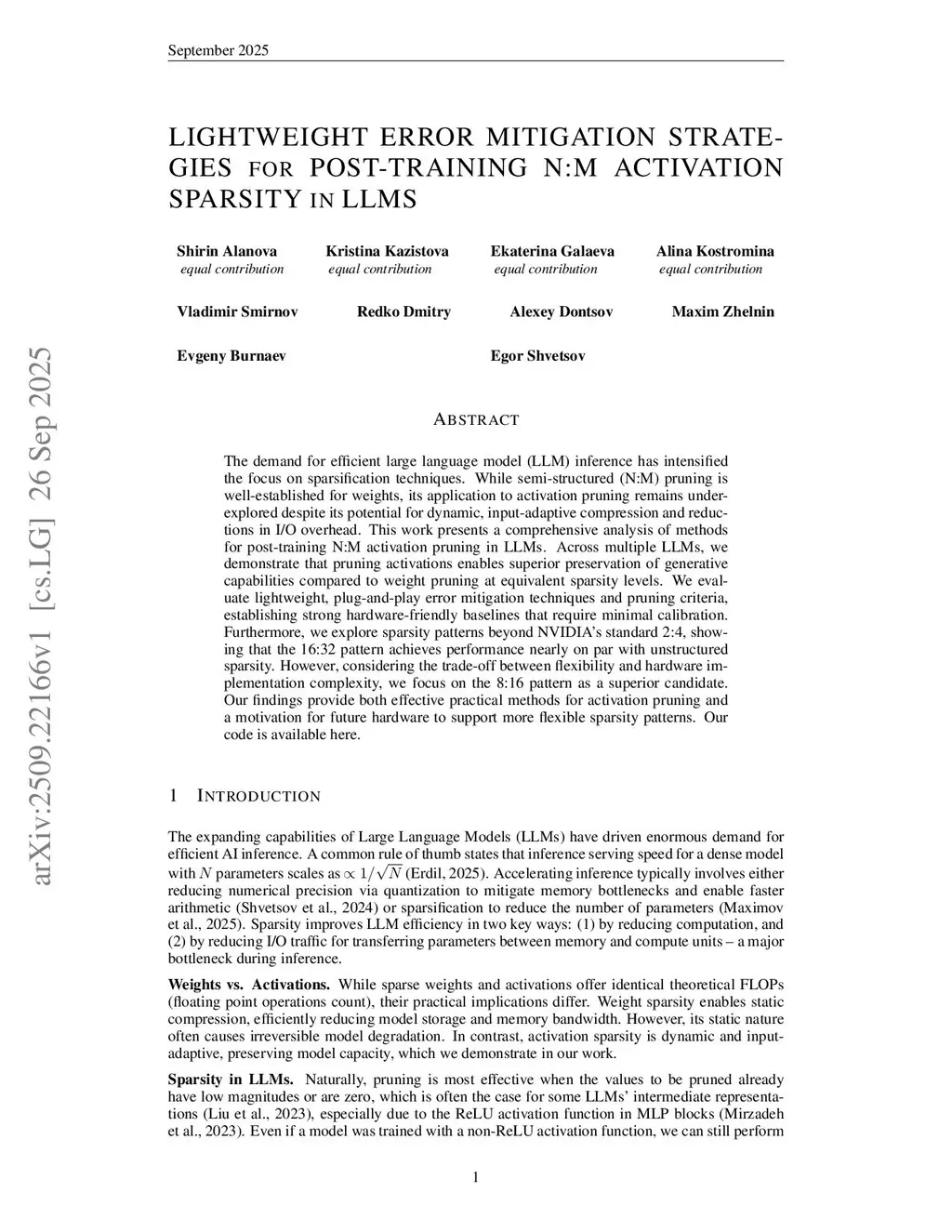 Lightweight error mitigation strategies for post-training N:M activation sparsity in LLMs