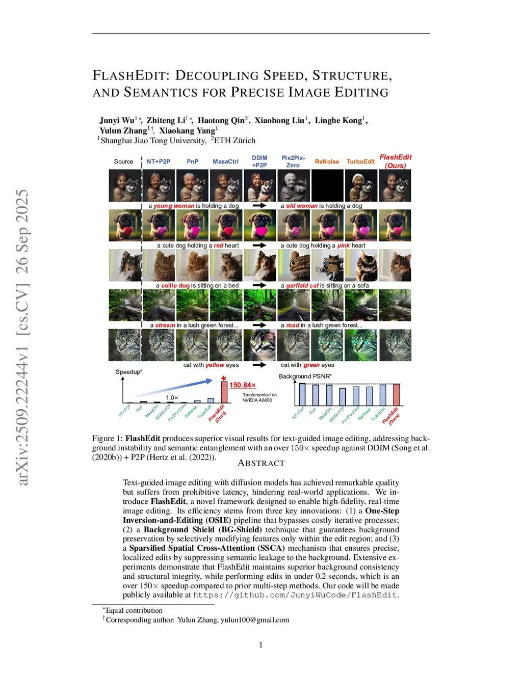 Text-guided image editing with diffusion models has achieved remarkable quality but suffers from prohibitive latency, hindering real-world applications. We introduce FlashEdit, a novel framework designed to enable high-fidelity, real-time image editing. Its efficiency stems from three key innovations: (1) a One-Step Inversion-and-Editing (OSIE) pipeline that bypasses costly iterative processes; (2) a Background Shield (BG-Shield) technique that guarantees background preservation by selectively modifying features only within the edit region; and (3) a Sparsified Spatial Cross-Attention (SSCA) mechanism that ensures precise, localized edits by suppressing semantic leakage to the background. Extensive experiments demonstrate that FlashEdit maintains superior background consistency and structural integrity, while performing edits in under 0.2 seconds, which is an over 150 speedup compared to prior multi-step methods. Our code will be made publicly available atthis https URL.