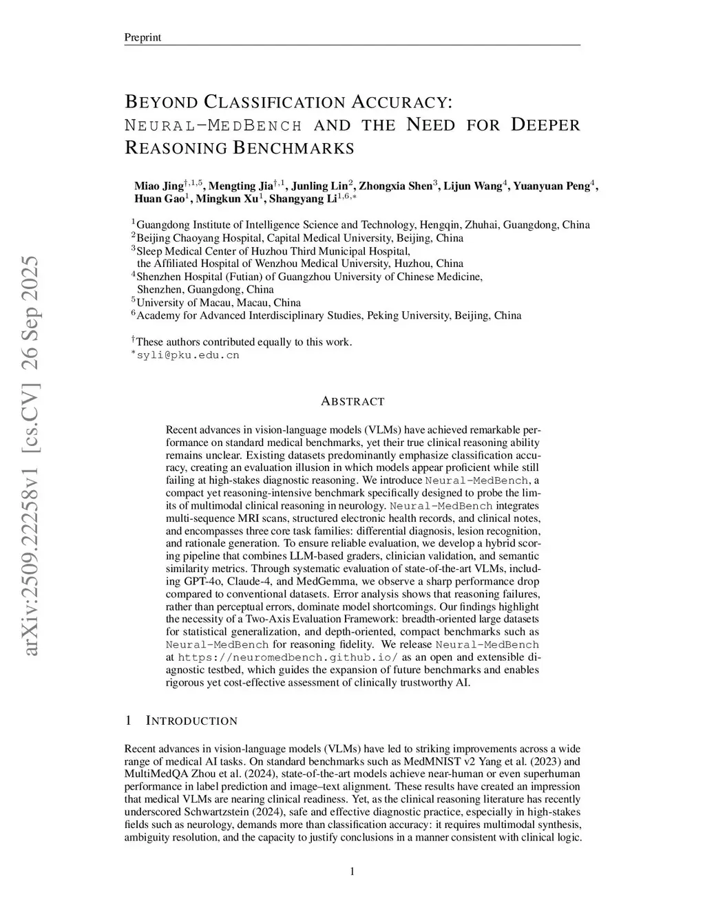 Recent advances in vision-language models (VLMs) have achieved remarkable performance on standard medical benchmarks, yet their true clinical reasoning ability remains unclear. Existing datasets predominantly emphasize classification accuracy, creating an evaluation illusion in which models appear proficient while still failing at high-stakes diagnostic reasoning. We introduce Neural-MedBench, a compact yet reasoning-intensive benchmark specifically designed to probe the limits of multimodal clinical reasoning in neurology. Neural-MedBench integrates multi-sequence MRI scans, structured electronic health records, and clinical notes, and encompasses three core task families: differential diagnosis, lesion recognition, and rationale generation. To ensure reliable evaluation, we develop a hybrid scoring pipeline that combines LLM-based graders, clinician validation, and semantic similarity metrics. Through systematic evaluation of state-of-the-art VLMs, including GPT-4o, Claude-4, and MedGemma, we observe a sharp performance drop compared to conventional datasets. Error analysis shows that reasoning failures, rather than perceptual errors, dominate model shortcomings. Our findings highlight the necessity of a Two-Axis Evaluation Framework: breadth-oriented large datasets for statistical generalization, and depth-oriented, compact benchmarks such as Neural-MedBench for reasoning fidelity. We release Neural-MedBench at this https URL as an open and extensible diagnostic testbed, which guides the expansion of future benchmarks and enables rigorous yet cost-effective assessment of clinically trustworthy AI.