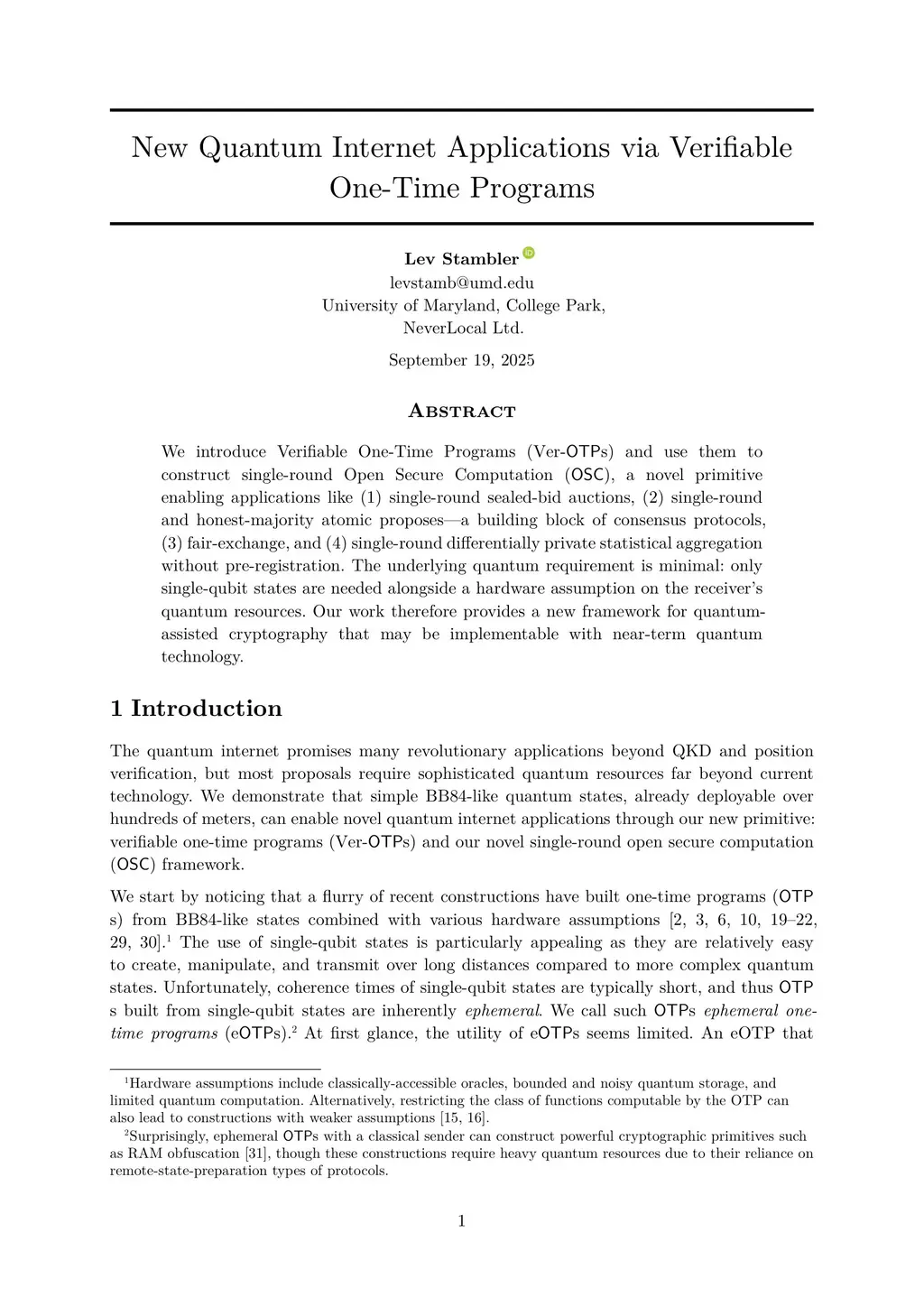 We introduce Verifiable One-Time Programs (Ver-OTPs) and use them to construct single-round Open Secure Computation (OSC), a novel primitive enabling applications like (1) single-round sealed-bid auctions, (2) single-round and honest-majority atomic proposes -- a building block of consensus protocols, and (3) single-round differentially private statistical aggregation without pre-registration. First, we construct Ver-OTPs from single-qubit states and classical cryptographic primitives. Then, assuming a multi-key homomorphic scheme (MHE) with certain properties, we use Ver-OTPs with MHE to construct OSC. The underlying quantum requirement is minimal: only single-qubit states are needed alongside a hardware assumption on the receiver's quantum resources. Our work therefore provides a new framework for quantum-assisted cryptography that may be implementable with near-term quantum technology.