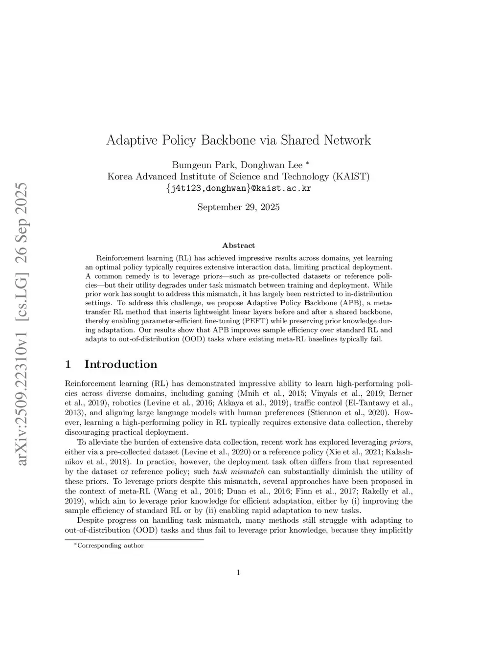 Reinforcement learning (RL) has achieved impressive results across domains, yet learning an optimal policy typically requires extensive interaction data, limiting practical deployment. A common remedy is to leverage priors, such as pre-collected datasets or reference policies, but their utility degrades under task mismatch between training and deployment. While prior work has sought to address this mismatch, it has largely been restricted to in-distribution settings. To address this challenge, we propose Adaptive Policy Backbone (APB), a meta-transfer RL method that inserts lightweight linear layers before and after a shared backbone, thereby enabling parameter-efficient fine-tuning (PEFT) while preserving prior knowledge during adaptation. Our results show that APB improves sample efficiency over standard RL and adapts to out-of-distribution (OOD) tasks where existing meta-RL baselines typically fail.
