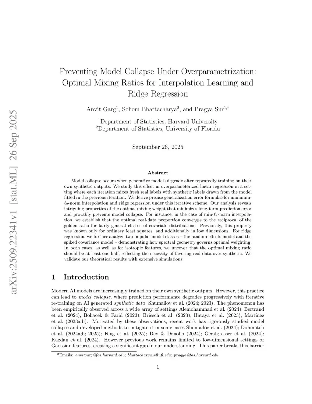 Model collapse occurs when generative models degrade after repeatedly training on their own synthetic outputs. We study this effect in overparameterized linear regression in a setting where each iteration mixes fresh real labels with synthetic labels drawn from the model fitted in the previous iteration. We derive precise generalization error formulae for minimum--norm interpolation and ridge regression under this iterative scheme. Our analysis reveals intriguing properties of the optimal mixing weight that minimizes long-term prediction error and provably prevents model collapse. For instance, in the case of min--norm interpolation, we establish that the optimal real-data proportion converges to the reciprocal of the golden ratio for fairly general classes of covariate distributions. Previously, this property was known only for ordinary least squares, and additionally in low dimensions. For ridge regression, we further analyze two popular model classes -- the random-effects model and the spiked covariance model -- demonstrating how spectral geometry governs optimal weighting. In both cases, as well as for isotropic features, we uncover that the optimal mixing ratio should be at least one-half, reflecting the necessity of favoring real-data over synthetic. We validate our theoretical results with extensive simulations.