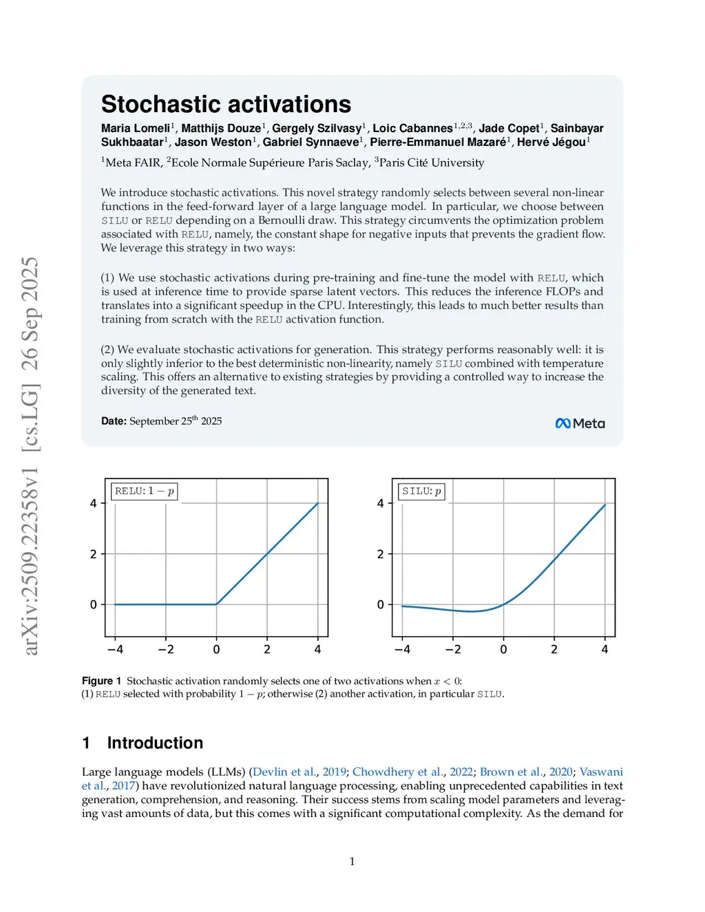 We introduce stochastic activations. This novel strategy randomly selects between several non-linear functions in the feed-forward layer of a large language model. In particular, we choose between SILU or RELU depending on a Bernoulli draw. This strategy circumvents the optimization problem associated with RELU, namely, the constant shape for negative inputs that prevents the gradient flow. We leverage this strategy in two ways:(1) We use stochastic activations during pre-training and fine-tune the model with RELU, which is used at inference time to provide sparse latent vectors. This reduces the inference FLOPs and translates into a significant speedup on CPU and GPU. This leads to better results than training from scratch with the RELU activation function.(2) We evaluate stochastic activations for sequence generation. This strategy performs reasonably well: it has higher diversity and has only slightly inferior performance to the best deterministic non-linearity, SILU, combined with temperature sampling. This provides an alternative way to increase the diversity of generated text.