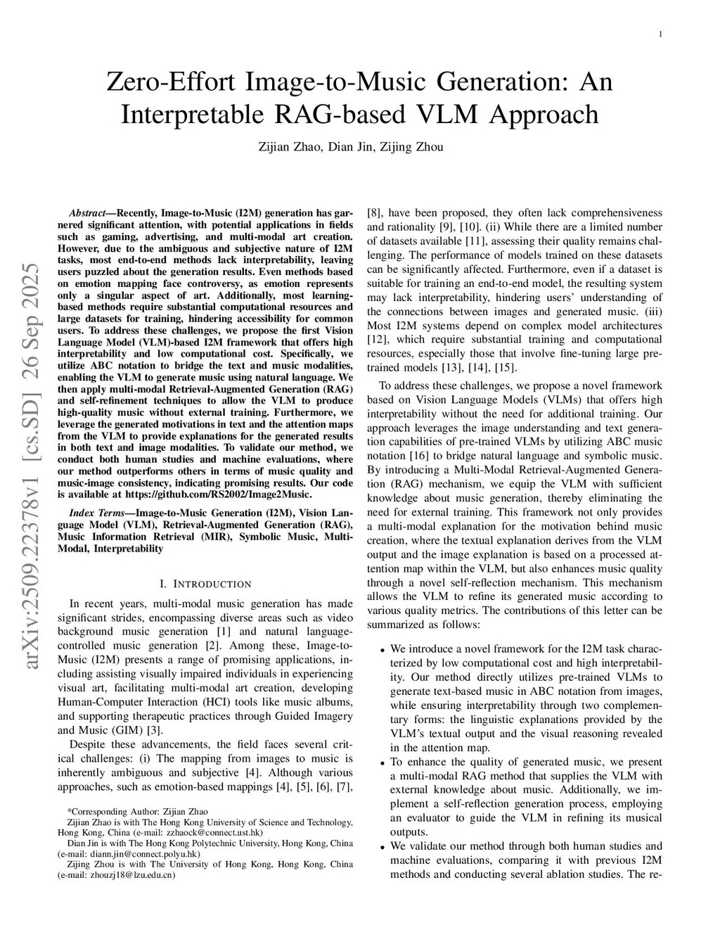Zero-Effort Image-to-Music Generation: An Interpretable RAG-based VLM Approach