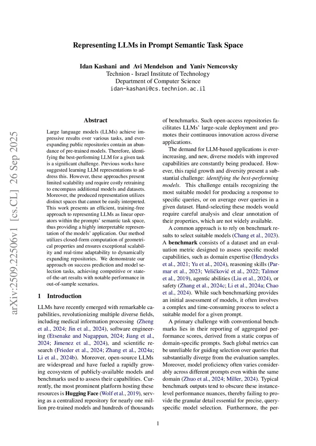 Large language models (LLMs) achieve impressive results over various tasks, and ever-expanding public repositories contain an abundance of pre-trained models. Therefore, identifying the best-performing LLM for a given task is a significant challenge. Previous works have suggested learning LLM representations to address this. However, these approaches present limited scalability and require costly retraining to encompass additional models and datasets. Moreover, the produced representation utilizes distinct spaces that cannot be easily interpreted. This work presents an efficient, training-free approach to representing LLMs as linear operators within the prompts' semantic task space, thus providing a highly interpretable representation of the models' application. Our method utilizes closed-form computation of geometrical properties and ensures exceptional scalability and real-time adaptability to dynamically expanding repositories. We demonstrate our approach on success prediction and model selection tasks, achieving competitive or state-of-the-art results with notable performance in out-of-sample scenarios.