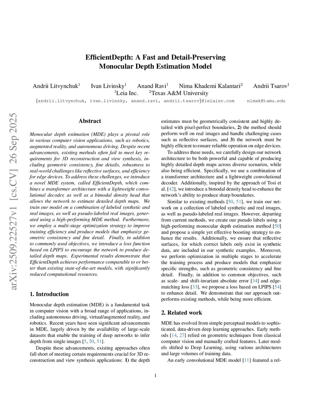 Monocular depth estimation (MDE) plays a pivotal role in various computer vision applications, such as robotics, augmented reality, and autonomous driving. Despite recent advancements, existing methods often fail to meet key requirements for 3D reconstruction and view synthesis, including geometric consistency, fine details, robustness to real-world challenges like reflective surfaces, and efficiency for edge devices. To address these challenges, we introduce a novel MDE system, called EfficientDepth, which combines a transformer architecture with a lightweight convolutional decoder, as well as a bimodal density head that allows the network to estimate detailed depth maps. We train our model on a combination of labeled synthetic and real images, as well as pseudo-labeled real images, generated using a high-performing MDE method. Furthermore, we employ a multi-stage optimization strategy to improve training efficiency and produce models that emphasize geometric consistency and fine detail. Finally, in addition to commonly used objectives, we introduce a loss function based on LPIPS to encourage the network to produce detailed depth maps. Experimental results demonstrate that EfficientDepth achieves performance comparable to or better than existing state-of-the-art models, with significantly reduced computational resources.