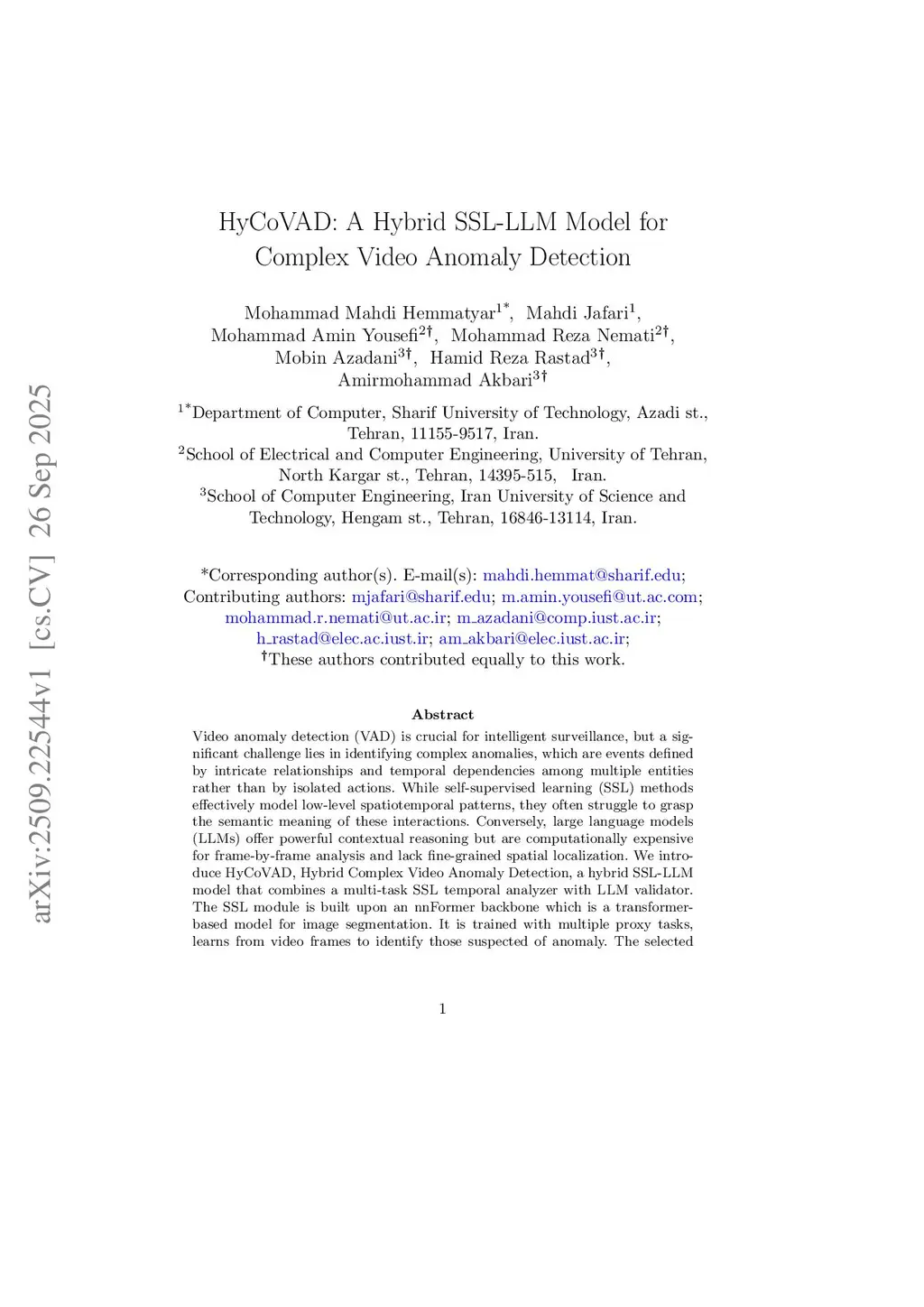HyCoVAD: A Hybrid SSL-LLM Model for Complex Video Anomaly Detection