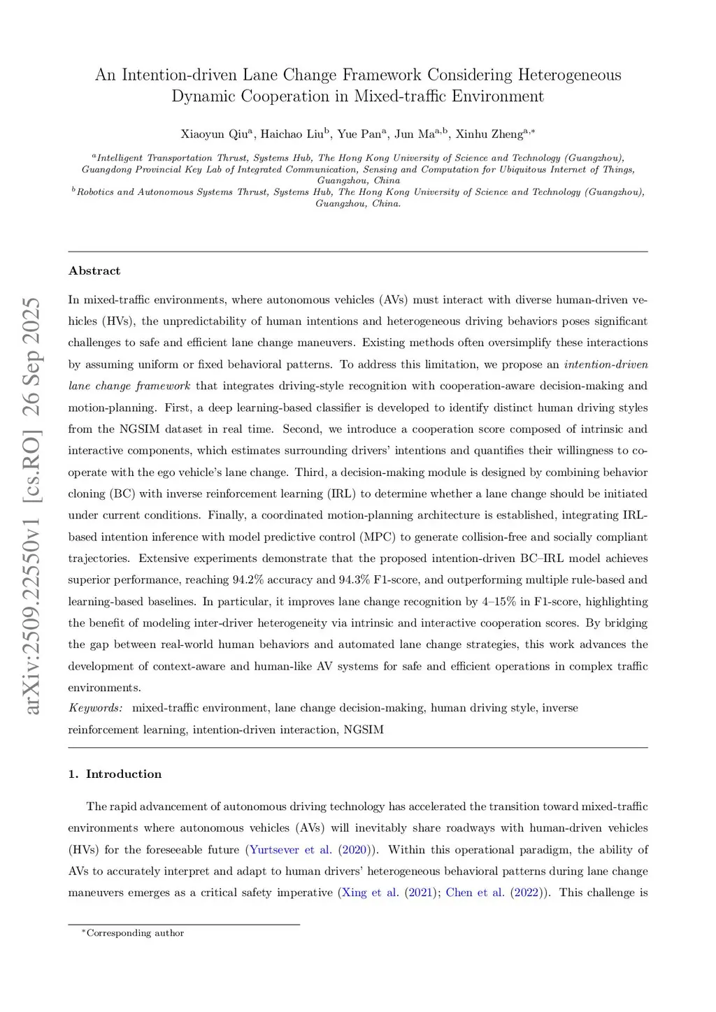 In mixed-traffic environments, where autonomous vehicles (AVs) interact with diverse human-driven vehicles (HVs), unpredictable intentions and heterogeneous behaviors make safe and efficient lane change maneuvers highly challenging. Existing methods often oversimplify these interactions by assuming uniform patterns. We propose an intention-driven lane change framework that integrates driving-style recognition, cooperation-aware decision-making, and coordinated motion planning. A deep learning classifier trained on the NGSIM dataset identifies human driving styles in real time. A cooperation score with intrinsic and interactive components estimates surrounding drivers' intentions and quantifies their willingness to cooperate with the ego vehicle. Decision-making combines behavior cloning with inverse reinforcement learning to determine whether a lane change should be initiated. For trajectory generation, model predictive control is integrated with IRL-based intention inference to produce collision-free and socially compliant maneuvers. Experiments show that the proposed model achieves 94.2\% accuracy and 94.3\% F1-score, outperforming rule-based and learning-based baselines by 4-15\% in lane change recognition. These results highlight the benefit of modeling inter-driver heterogeneity and demonstrate the potential of the framework to advance context-aware and human-like autonomous driving in complex traffic environments.