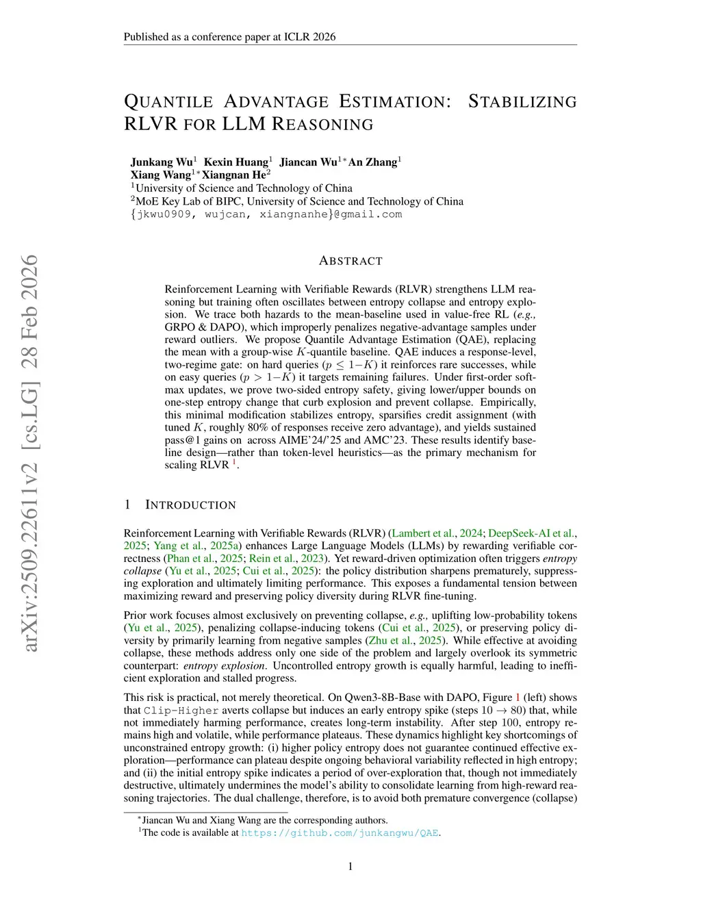 Reinforcement Learning with Verifiable Rewards (RLVR) strengthens LLM reasoning, but training often oscillates between {entropy collapse} and {entropy explosion}. We trace both hazards to the mean baseline used in value-free RL (e.g., GRPO and DAPO), which improperly penalizes negative-advantage samples under reward outliers. We propose {Quantile Advantage Estimation} (QAE), replacing the mean with a group-wise K-quantile baseline. QAE induces a response-level, two-regime gate: on hard queries (p <= 1 - K) it reinforces rare successes, while on easy queries (p > 1 - K) it targets remaining failures. Under first-order softmax updates, we prove {two-sided entropy safety}, giving lower and upper bounds on one-step entropy change that curb explosion and prevent collapse. Empirically, this minimal modification stabilizes entropy, sparsifies credit assignment (with tuned K, roughly 80% of responses receive zero advantage), and yields sustained pass@1 gains on Qwen3-8B/14B-Base across AIME 2024/2025 and AMC 2023. These results identify {baseline design} -- rather than token-level heuristics -- as the primary mechanism for scaling RLVR.