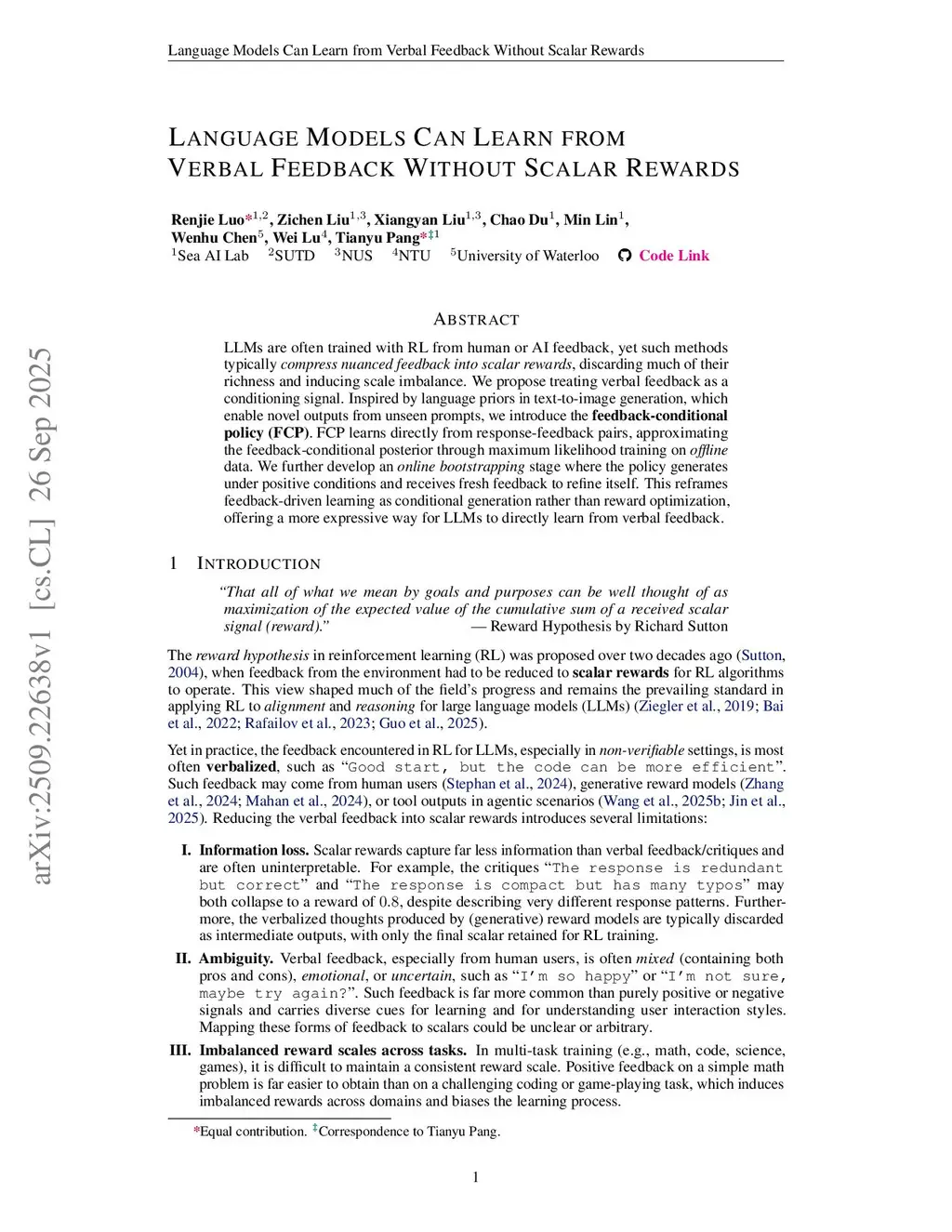 LLMs are often trained with RL from human or AI feedback, yet such methods typically compress nuanced feedback into scalar rewards, discarding much of their richness and inducing scale imbalance. We propose treating verbal feedback as a conditioning signal. Inspired by language priors in text-to-image generation, which enable novel outputs from unseen prompts, we introduce the feedback-conditional policy (FCP). FCP learns directly from response-feedback pairs, approximating the feedback-conditional posterior through maximum likelihood training on offline data. We further develop an online bootstrapping stage where the policy generates under positive conditions and receives fresh feedback to refine itself. This reframes feedback-driven learning as conditional generation rather than reward optimization, offering a more expressive way for LLMs to directly learn from verbal feedback. Our code is available atthis https URL.