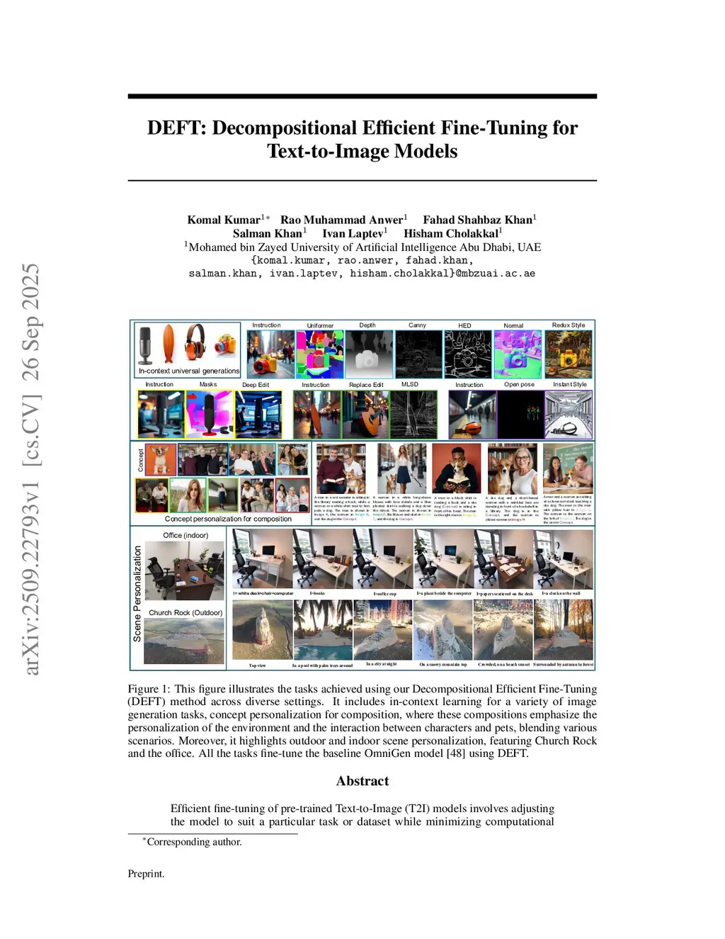 Efficient fine-tuning of pre-trained Text-to-Image (T2I) models involves adjusting the model to suit a particular task or dataset while minimizing computational resources and limiting the number of trainable parameters. However, it often faces challenges in striking a trade-off between aligning with the target distribution: learning a novel concept from a limited image for personalization and retaining the instruction ability needed for unifying multiple tasks, all while maintaining editability (aligning with a variety of prompts or in-context generation). In this work, we introduce DEFT, Decompositional Efficient Fine-Tuning, an efficient fine-tuning framework that adapts a pre-trained weight matrix by decomposing its update into two components with two trainable matrices: (1) a projection onto the complement of a low-rank subspace spanned by a low-rank matrix, and (2) a low-rank update. The single trainable low-rank matrix defines the subspace, while the other trainable low-rank matrix enables flexible parameter adaptation within that subspace. We conducted extensive experiments on the Dreambooth and Dreambench Plus datasets for personalization, the InsDet dataset for object and scene adaptation, and the VisualCloze dataset for a universal image generation framework through visual in-context learning with both Stable Diffusion and a unified model. Our results demonstrated state-of-the-art performance, highlighting the emergent properties of efficient fine-tuning. Our code is available on \href{this https URL}{DEFTBase}.