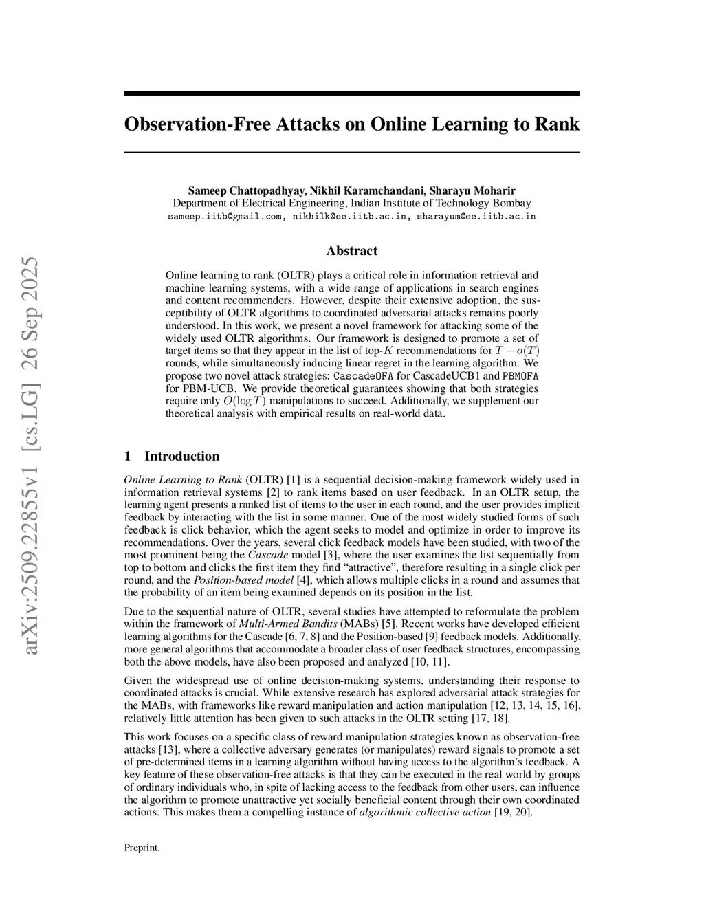 Online learning to rank (OLTR) plays a critical role in information retrieval and machine learning systems, with a wide range of applications in search engines and content recommenders. However, despite their extensive adoption, the susceptibility of OLTR algorithms to coordinated adversarial attacks remains poorly understood. In this work, we present a novel framework for attacking some of the widely used OLTR algorithms. Our framework is designed to promote a set of target items so that they appear in the list of top-K recommendations for T - o(T) rounds, while simultaneously inducing linear regret in the learning algorithm. We propose two novel attack strategies: CascadeOFA for CascadeUCB1 and PBMOFA for PBM-UCB . We provide theoretical guarantees showing that both strategies require only O(log T) manipulations to succeed. Additionally, we supplement our theoretical analysis with empirical results on real-world data.