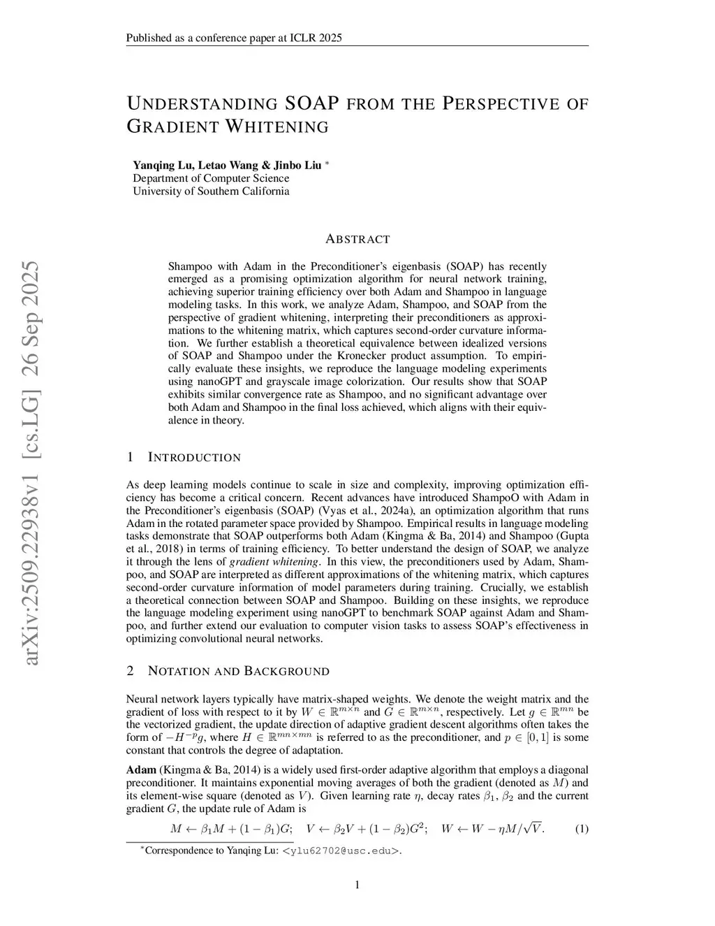 Shampoo with Adam in the Preconditioner's eigenbasis (SOAP) has recently emerged as a promising optimization algorithm for neural network training, achieving superior training efficiency over both Adam and Shampoo in language modeling tasks. In this work, we analyze Adam, Shampoo, and SOAP from the perspective of gradient whitening, interpreting their preconditioners as approximations to the whitening matrix, which captures second-order curvature information. We further establish a theoretical equivalence between idealized versions of SOAP and Shampoo under the Kronecker product assumption. To empirically evaluate these insights, we reproduce the language modeling experiments using nanoGPT and grayscale image colorization. Our results show that SOAP exhibits similar convergence rate as Shampoo, and no significant advantage over both Adam and Shampoo in the final loss achieved, which aligns with their equivalence in theory.
