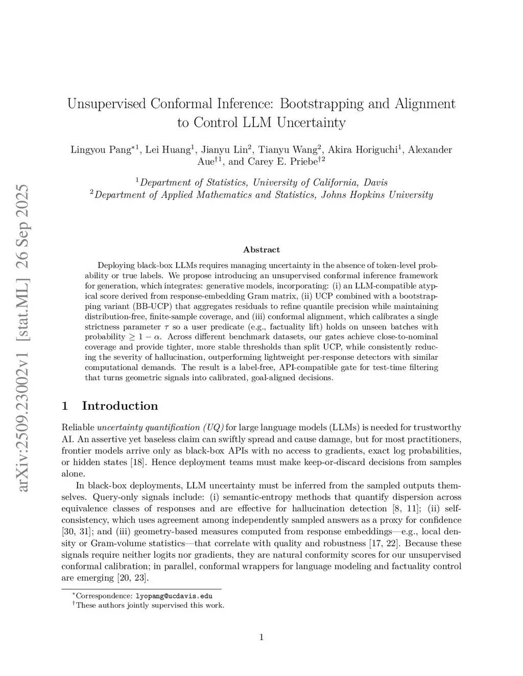 Deploying black-box LLMs requires managing uncertainty in the absence of token-level probability or true labels. We propose introducing an unsupervised conformal inference framework for generation, which integrates: generative models, incorporating: (i) an LLM-compatible atypical score derived from response-embedding Gram matrix, (ii) UCP combined with a bootstrapping variant (BB-UCP) that aggregates residuals to refine quantile precision while maintaining distribution-free, finite-sample coverage, and (iii) conformal alignment, which calibrates a single strictness parameter so a user predicate (e.g., factuality lift) holds on unseen batches with probability . Across different benchmark datasets, our gates achieve close-to-nominal coverage and provide tighter, more stable thresholds than split UCP, while consistently reducing the severity of hallucination, outperforming lightweight per-response detectors with similar computational demands. The result is a label-free, API-compatible gate for test-time filtering that turns geometric signals into calibrated, goal-aligned decisions.