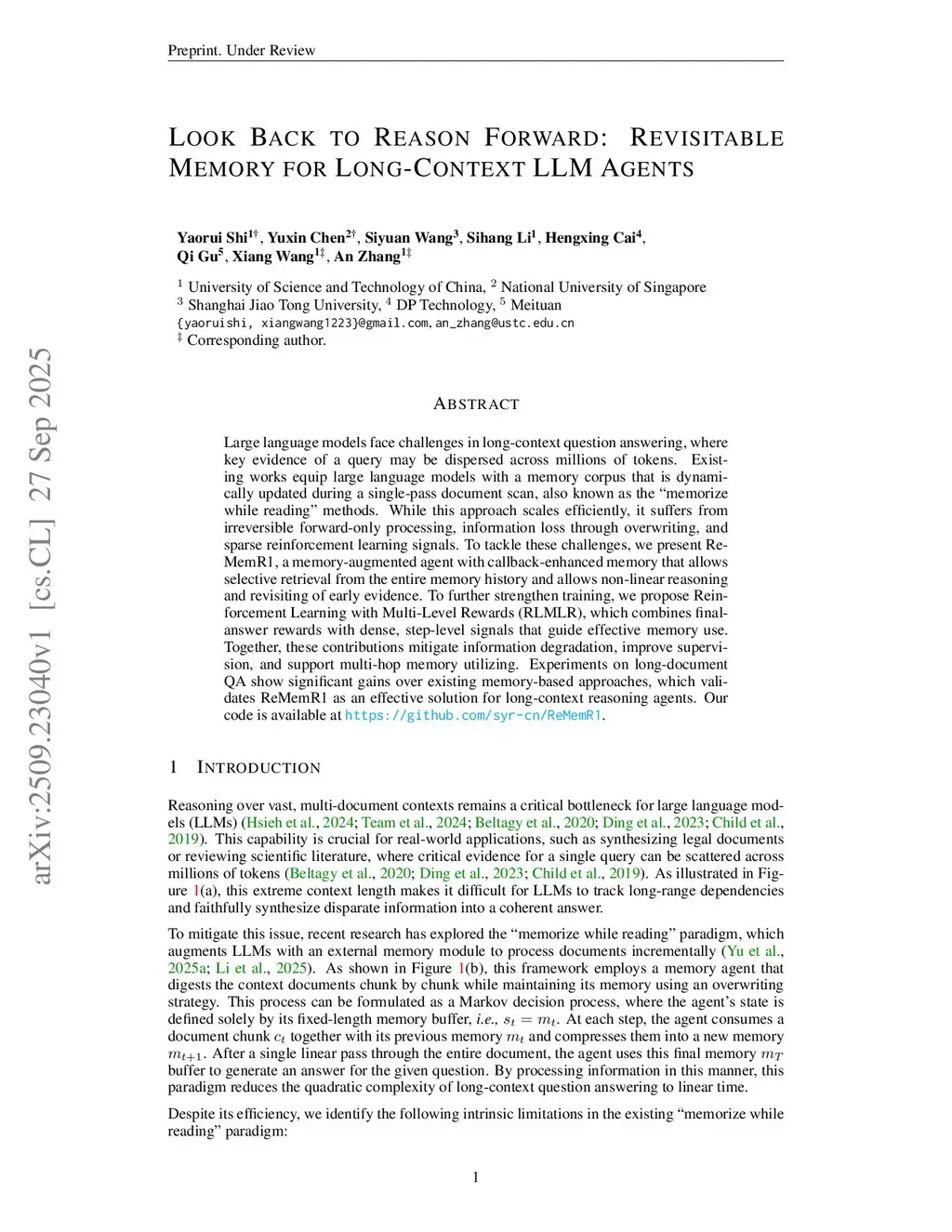 Large language models face challenges in long-context question answering, where key evidence of a query may be dispersed across millions of tokens. Existing works equip large language models with a memory corpus that is dynamically updated during a single-pass document scan, also known as the "memorize while reading" methods. While this approach scales efficiently, it suffers from irreversible forward-only processing, information loss through overwriting, and sparse reinforcement learning signals. To tackle these challenges, we present ReMemR1, a memory-augmented agent with callback-enhanced memory that allows selective retrieval from the entire memory history and allows non-linear reasoning and revisiting of early evidence. To further strengthen training, we propose Reinforcement Learning with Multi-Level Rewards (RLMLR), which combines final-answer rewards with dense, step-level signals that guide effective memory use. Together, these contributions mitigate information degradation, improve supervision, and support multi-hop memory utilizing. Experiments on long-document QA show significant gains over existing memory-based approaches, which validates ReMemR1 as an effective solution for long-context reasoning agents.