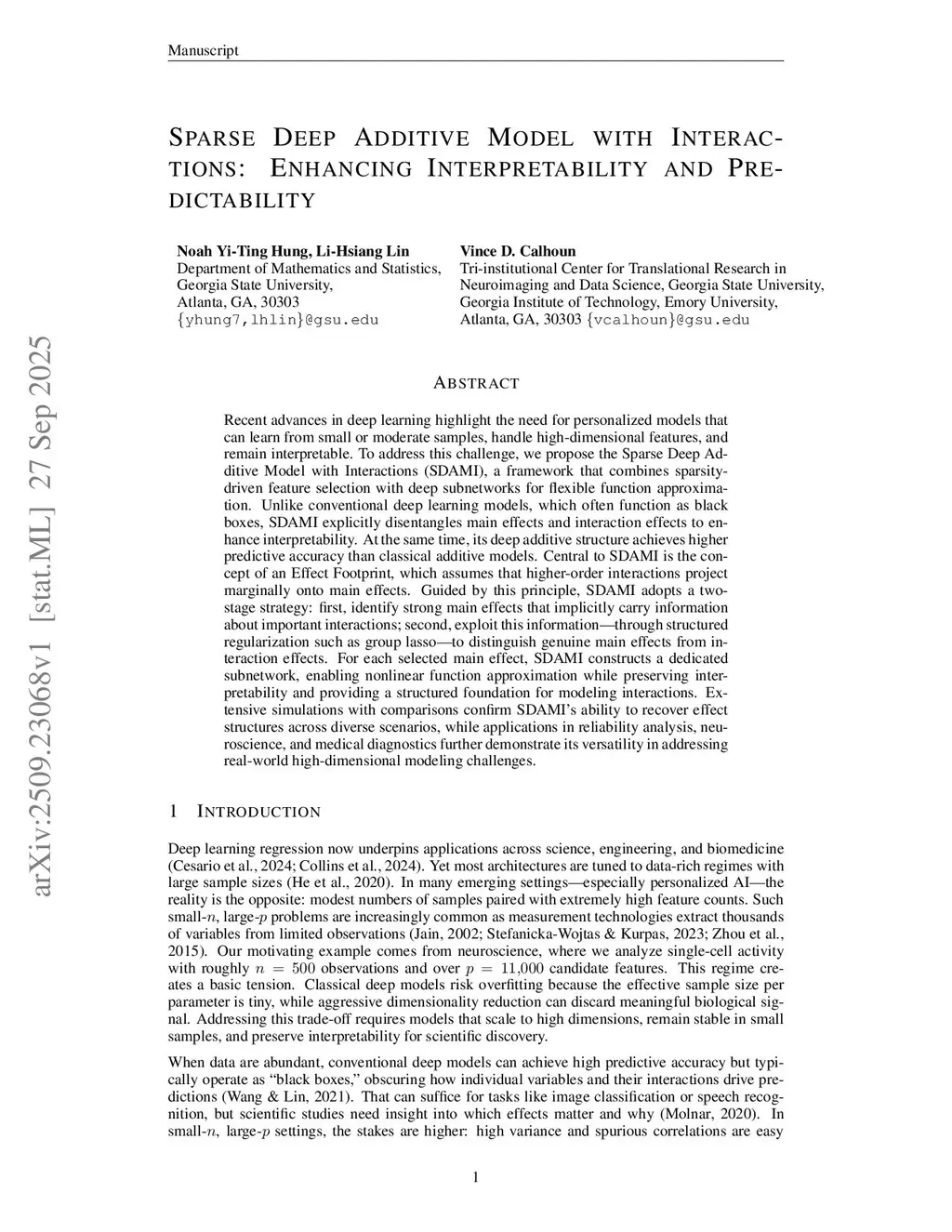 Recent advances in deep learning highlight the need for personalized models that can learn from small or moderate samples, handle high dimensional features, and remain interpretable. To address this challenge, we propose the Sparse Deep Additive Model with Interactions (SDAMI), a framework that combines sparsity driven feature selection with deep subnetworks for flexible function approximation. Unlike conventional deep learning models, which often function as black boxes, SDAMI explicitly disentangles main effects and interaction effects to enhance interpretability. At the same time, its deep additive structure achieves higher predictive accuracy than classical additive models. Central to SDAMI is the concept of an Effect Footprint, which assumes that higher order interactions project marginally onto main effects. Guided by this principle, SDAMI adopts a two stage strategy: first, identify strong main effects that implicitly carry information about important interactions. second, exploit this information through structured regularization such as group lasso to distinguish genuine main effects from interaction effects. For each selected main effect, SDAMI constructs a dedicated subnetwork, enabling nonlinear function approximation while preserving interpretability and providing a structured foundation for modeling interactions. Extensive simulations with comparisons confirm SDAMIs ability to recover effect structures across diverse scenarios, while applications in reliability analysis, neuroscience, and medical diagnostics further demonstrate its versatility in addressing real-world high-dimensional modeling challenges.