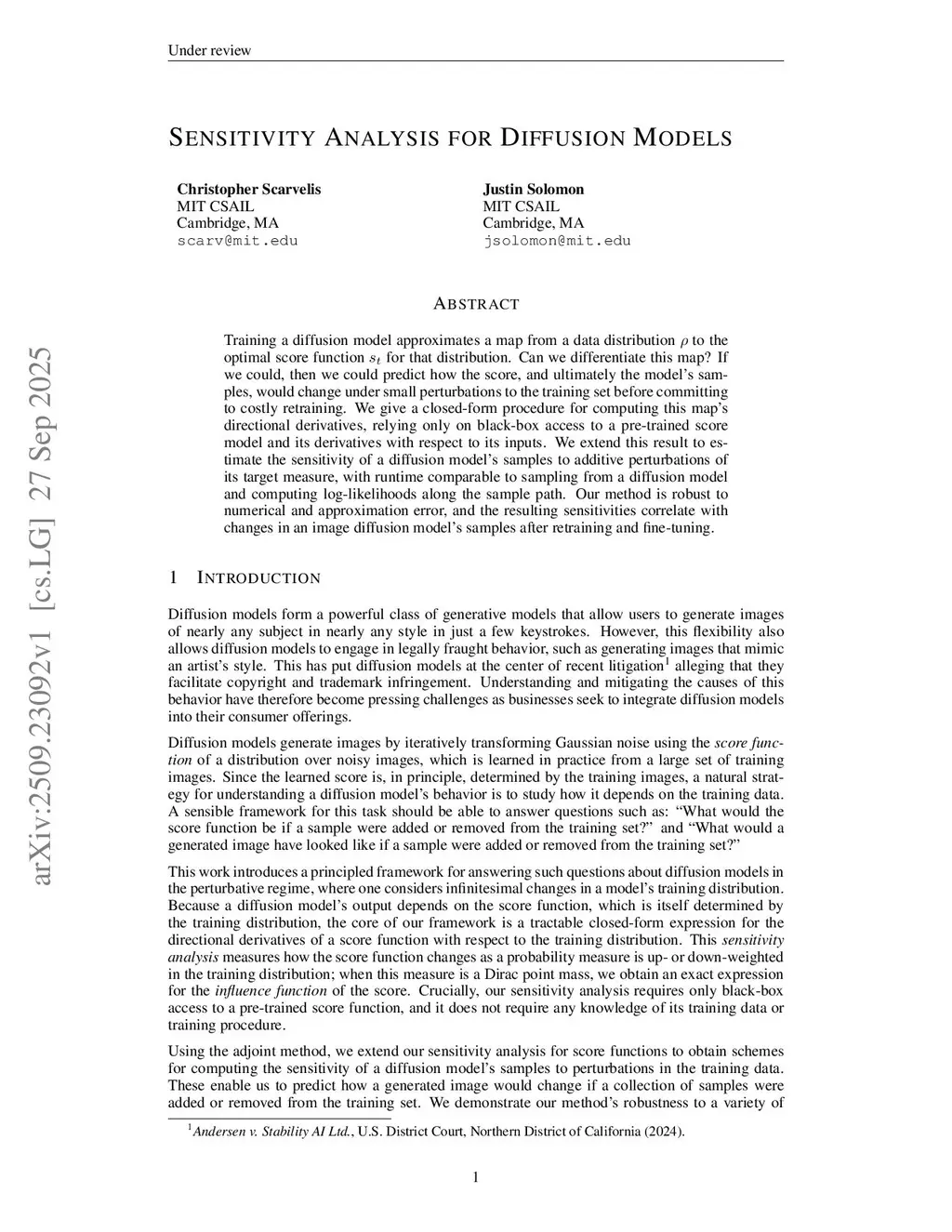 Training a diffusion model approximates a map from a data distribution to the optimal score function for that distribution. Can we differentiate this map? If we could, then we could predict how the score, and ultimately the model's samples, would change under small perturbations to the training set before committing to costly retraining. We give a closed-form procedure for computing this map's directional derivatives, relying only on black-box access to a pre-trained score model and its derivatives with respect to its inputs. We extend this result to estimate the sensitivity of a diffusion model's samples to additive perturbations of its target measure, with runtime comparable to sampling from a diffusion model and computing log-likelihoods along the sample path. Our method is robust to numerical and approximation error, and the resulting sensitivities correlate with changes in an image diffusion model's samples after retraining and fine-tuning.