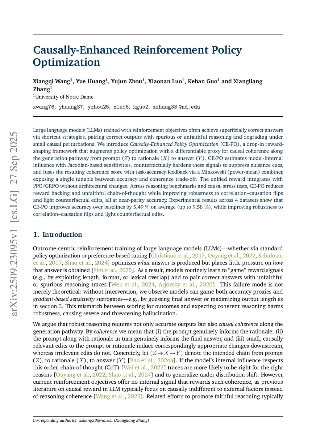Large language models (LLMs) trained with reinforcement objectives often achieve superficially correct answers via shortcut strategies, pairing correct outputs with spurious or unfaithful reasoning and degrading under small causal perturbations. We introduce Causally-Enhanced Policy Optimization (CE-PO), a drop-in reward-shaping framework that augments policy optimization with a differentiable proxy for causal coherence along the generation pathway from prompt (Z) to rationale (X) to answer (Y). CE-PO estimates model-internal influence with Jacobian-based sensitivities, counterfactually hardens these signals to suppress nuisance cues, and fuses the resulting coherence score with task-accuracy feedback via a Minkowski (power-mean) combiner, exposing a single tunable between accuracy and coherence trade-off. The unified reward integrates with PPO/GRPO without architectural changes. Across reasoning benchmarks and causal stress tests, CE-PO reduces reward hacking and unfaithful chain-of-thought while improving robustness to correlation-causation flips and light counterfactual edits, all at near-parity accuracy. Experimental results across 4 datasets show that CE-PO improves accuracy over baselines by 5.49% on average (up to 9.58%), while improving robustness to correlation-causation flips and light counterfactual edits.