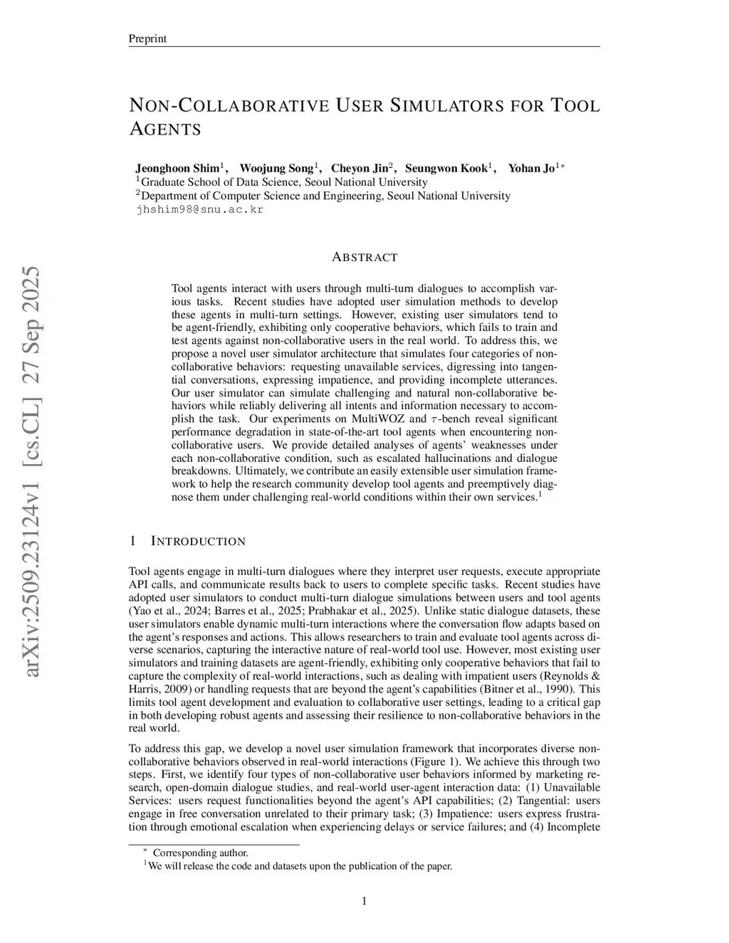 Tool agents interact with users through multi-turn dialogues to accomplish various tasks. Recent studies have adopted user simulation methods to develop these agents in multi-turn settings. However, existing user simulators tend to be agent-friendly, exhibiting only cooperative behaviors, which fails to train and test agents against non-collaborative users in the real world. To address this, we propose a novel user simulator architecture that simulates four categories of non-collaborative behaviors: requesting unavailable services, digressing into tangential conversations, expressing impatience, and providing incomplete utterances. Our user simulator can simulate challenging and natural non-collaborative behaviors while reliably delivering all intents and information necessary to accomplish the task. Our experiments on MultiWOZ and -bench reveal significant performance degradation in state-of-the-art tool agents when encountering non-collaborative users. We provide detailed analyses of agents' weaknesses under each non-collaborative condition, such as escalated hallucinations and dialogue breakdowns. Ultimately, we contribute an easily extensible user simulation framework to help the research community develop tool agents and preemptively diagnose them under challenging real-world conditions within their own services.