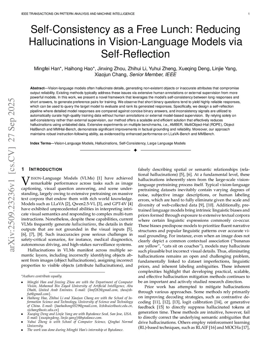 Vision-language models often hallucinate details, generating non-existent objects or inaccurate attributes that compromise output reliability. Existing methods typically address these issues via extensive human annotations or external supervision from more powerful models. In this work, we present a novel framework that leverages the model's self-consistency between long responses and short answers to generate preference pairs for training. We observe that short binary questions tend to yield highly reliable responses, which can be used to query the target model to evaluate and rank its generated responses. Specifically, we design a self-reflection pipeline where detailed model responses are compared against concise binary answers, and inconsistency signals are utilized to automatically curate high-quality training data without human annotations or external model-based supervision. By relying solely on self-consistency rather than external supervision, our method offers a scalable and efficient solution that effectively reduces hallucinations using unlabeled data. Extensive experiments on multiple benchmarks, i.e., AMBER, MultiObject-Hal (ROPE), Object HalBench, and MMHal-Bench, demonstrate significant improvements in factual grounding and reliability. Moreover, our approach maintains robust instruction-following ability, as evidenced by enhanced performance on LLaVA-Bench and MMBench.