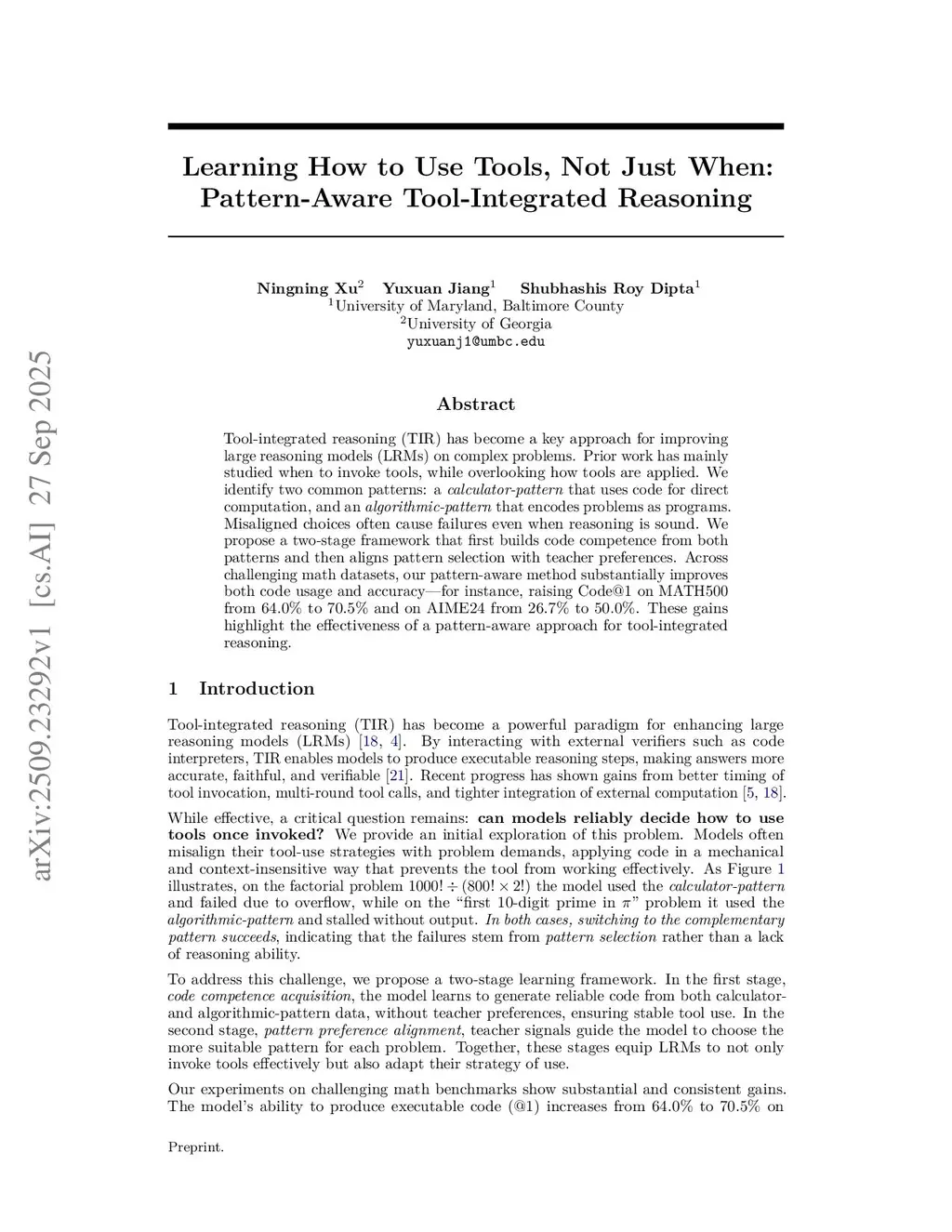 Tool-integrated reasoning (TIR) has become a key approach for improving large reasoning models (LRMs) on complex problems. Prior work has mainly studied when to invoke tools, while overlooking how tools are applied. We identify two common patterns: a calculator pattern that uses code for direct computation, and an algorithmic pattern that encodes problems as programs. Misaligned choices often cause failures even when reasoning is sound. We propose a two-stage framework that first builds code competence from both patterns and then aligns pattern selection with teacher preferences. Across challenging math datasets, our pattern-aware method substantially improves both code usage and accuracy, for instance raising Code@1 on MATH500 from 64.0% to 70.5% and on AIME24 from 26.7% to 50.0%. These gains highlight the effectiveness of a pattern-aware approach for tool-integrated reasoning.