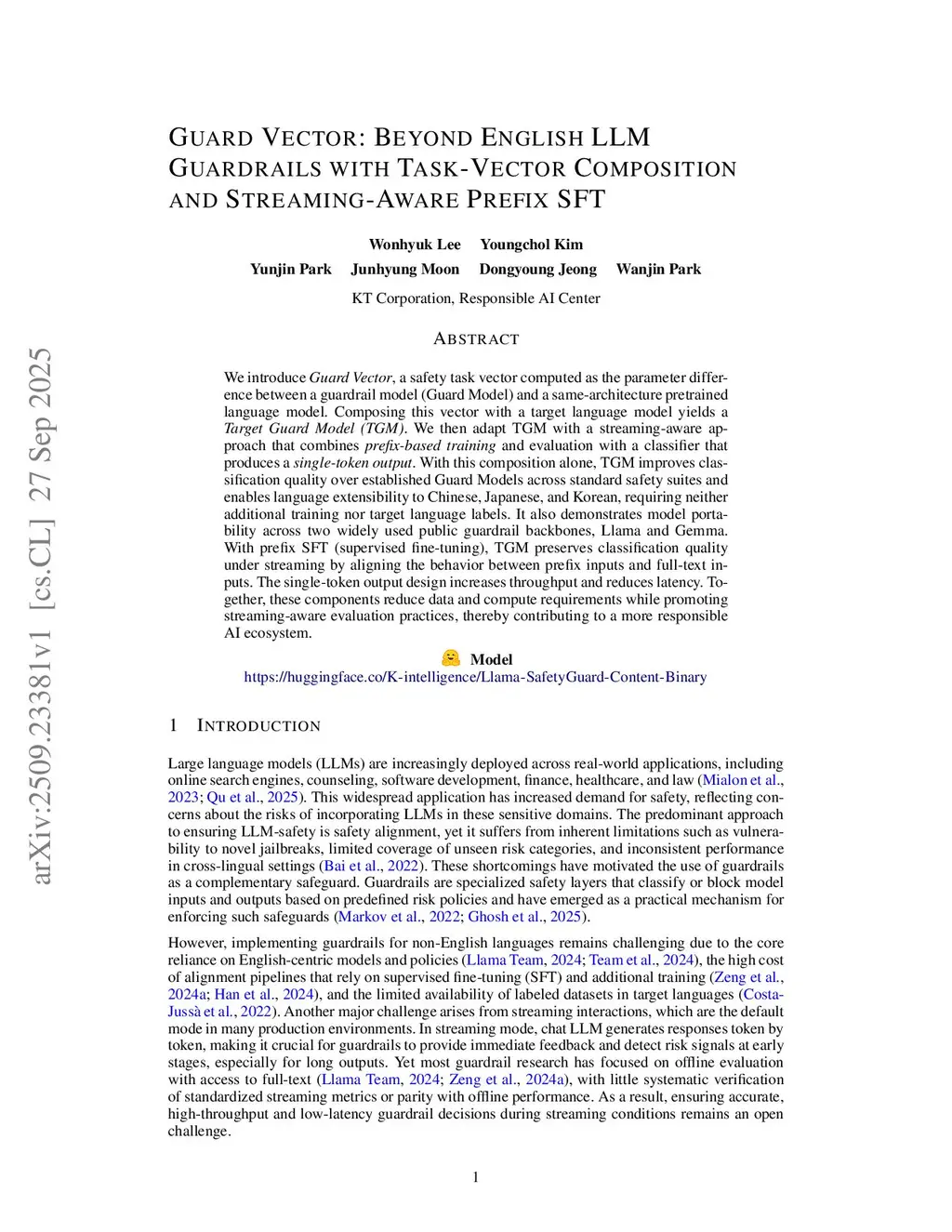 We introduce Guard Vector, a safety task vector computed as the parameter difference between a guardrail model (Guard Model) and a same-architecture pretrained language model. Composing this vector with a target language model yields a Target Guard Model (TGM). We then adapt TGM with a streaming-aware approach that combines prefix-based training and evaluation with a classifier that produces a single-token output. With this composition alone, TGM improves classification quality over established Guard Models across standard safety suites and enables language extensibility to Chinese, Japanese, and Korean, requiring neither additional training nor target language labels. It also demonstrates model portability across two widely used public guardrail backbones, Llama and Gemma. With prefix SFT (supervised fine-tuning), TGM preserves classification quality under streaming by aligning the behavior between prefix inputs and full-text inputs. The single-token output design increases throughput and reduces latency. Together, these components reduce data and compute requirements while promoting streaming-aware evaluation practices, thereby contributing to a more responsible AI ecosystem.