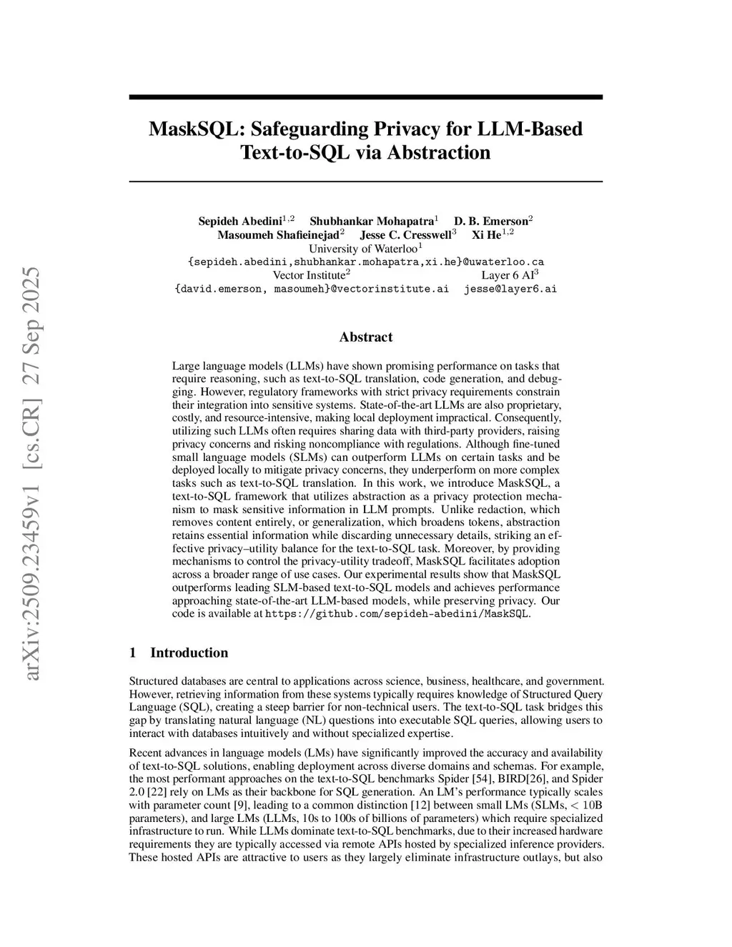 MaskSQL: Safeguarding Privacy for LLM-Based Text-to-SQL via Abstraction