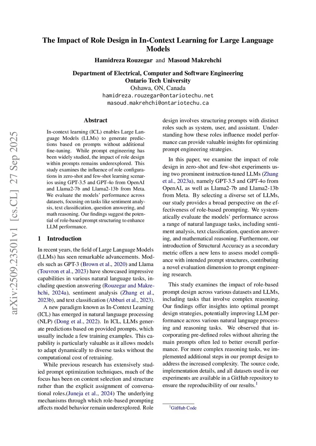 In-context learning (ICL) enables Large Language Models (LLMs) to generate predictions based on prompts without additional fine-tuning. While prompt engineering has been widely studied, the impact of role design within prompts remains underexplored. This study examines the influence of role configurations in zero-shot and few-shot learning scenarios using GPT-3.5 and GPT-4o from OpenAI and Llama2-7b and Llama2-13b from Meta. We evaluate the models' performance across datasets, focusing on tasks like sentiment analysis, text classification, question answering, and math reasoning. Our findings suggest the potential of role-based prompt structuring to enhance LLM performance.