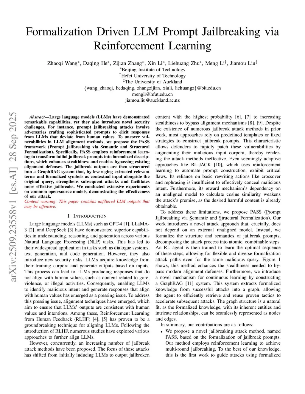 Large language models (LLMs) have demonstrated remarkable capabilities, yet they also introduce novel security challenges. For instance, prompt jailbreaking attacks involve adversaries crafting sophisticated prompts to elicit responses from LLMs that deviate from human values. To uncover vulnerabilities in LLM alignment methods, we propose the PASS framework (\underline{P}rompt J\underline{a}ilbreaking via \underline{S}emantic and \underline{S}tructural Formalization). Specifically, PASS employs reinforcement learning to transform initial jailbreak prompts into formalized descriptions, which enhances stealthiness and enables bypassing existing alignment defenses. The jailbreak outputs are then structured into a GraphRAG system that, by leveraging extracted relevant terms and formalized symbols as contextual input alongside the original query, strengthens subsequent attacks and facilitates more effective jailbreaks. We conducted extensive experiments on common open-source models, demonstrating the effectiveness of our attack.