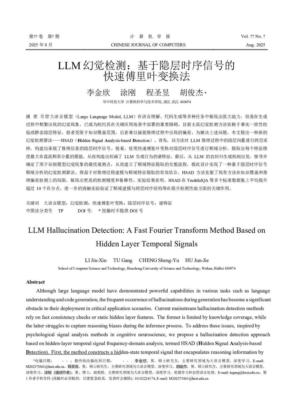 Although Large Language Models have demonstrated powerful capabilities in a wide range of tasks such as language understanding and code generation, the frequent occurrence of hallucinations during the generation process has become a significant impediment to their deployment in critical application scenarios. Current mainstream hallucination detection methods rely on factual consistency verification or static hidden layer features. The former is constrained by the scope of knowledge coverage, while the latter struggles to capture reasoning biases during the inference process. To address these issues, and inspired by signal analysis methods in cognitive neuroscience, this paper proposes a hallucination detection method based on the frequency-domain analysis of hidden layer temporal signals, named HSAD (\textbf{H}idden \textbf{S}ignal \textbf{A}nalysis-based \textbf{D}etection). First, by treating the LLM's reasoning process as a cognitive journey that unfolds over time, we propose modeling and simulating the human process of signal perception and discrimination in a deception-detection scenario through hidden layer temporal signals. Next, The Fast Fourier Transform is applied to map these temporal signals into the frequency domain to construct spectral features, which are used to capture anomalies that arise during the reasoning process; analysis experiments on these spectral features have proven the effectiveness of this approach. Finally, a hallucination detection algorithm is designed based on these spectral features to identify hallucinations in the generated content. By effectively combining the modeling of the reasoning process with frequency-domain feature extraction, the HSAD method overcomes the limitations of existing approaches in terms of knowledge coverage and the detection of reasoning biases, demonstrating higher detection accuracy and robustness.