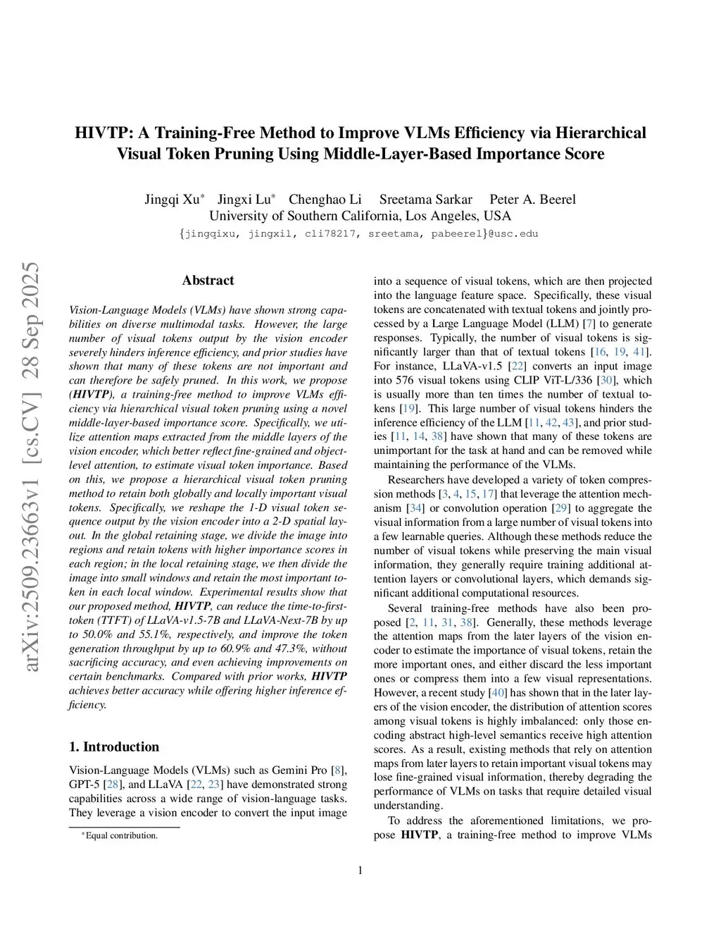 HIVTP: A Training-Free Method to Improve VLMs Efficiency via Hierarchical Visual Token Pruning Using Middle-Layer-Based Importance Score