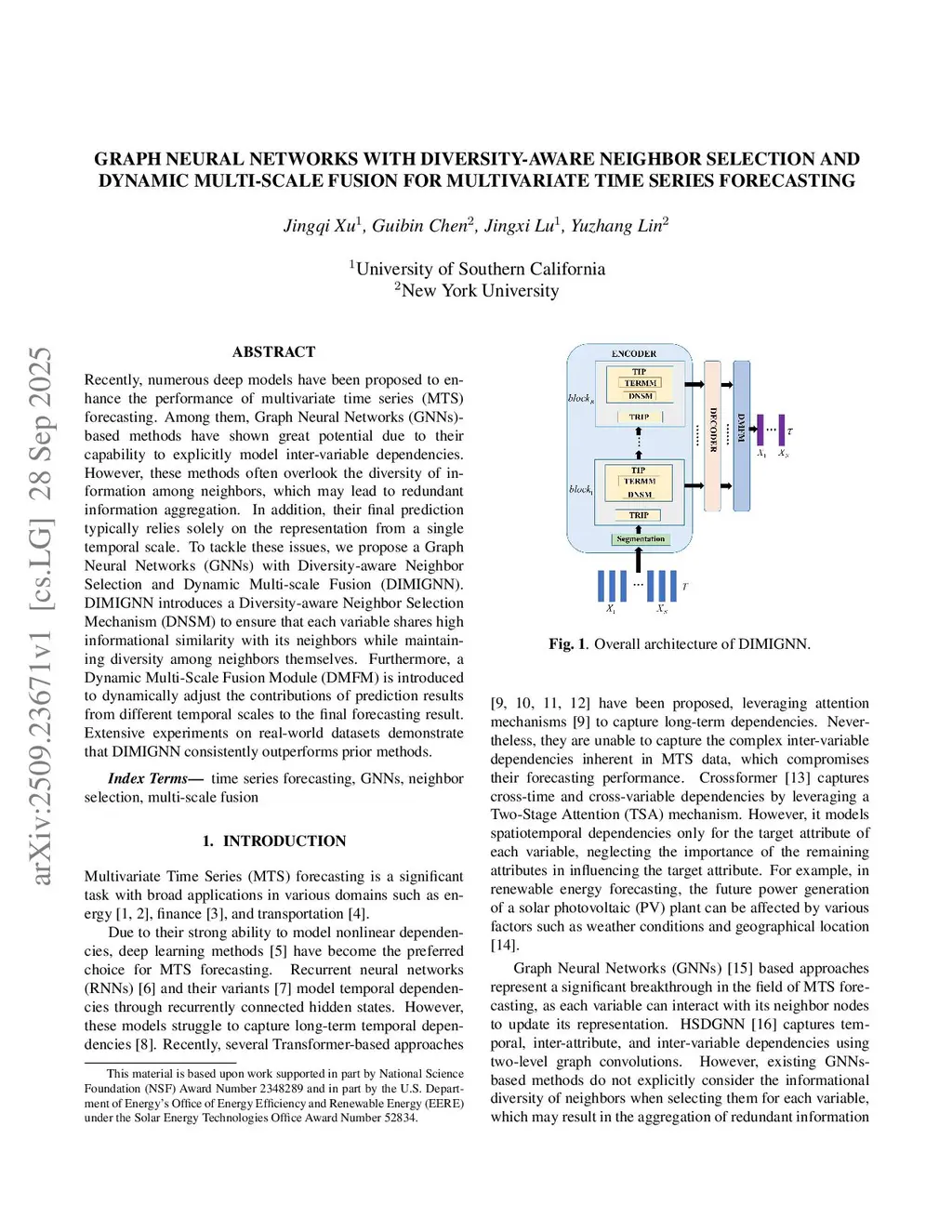 Recently, numerous deep models have been proposed to enhance the performance of multivariate time series (MTS) forecasting. Among them, Graph Neural Networks (GNNs)-based methods have shown great potential due to their capability to explicitly model inter-variable dependencies. However, these methods often overlook the diversity of information among neighbors, which may lead to redundant information aggregation. In addition, their final prediction typically relies solely on the representation from a single temporal scale. To tackle these issues, we propose a Graph Neural Networks (GNNs) with Diversity-aware Neighbor Selection and Dynamic Multi-scale Fusion (DIMIGNN). DIMIGNN introduces a Diversity-aware Neighbor Selection Mechanism (DNSM) to ensure that each variable shares high informational similarity with its neighbors while maintaining diversity among neighbors themselves. Furthermore, a Dynamic Multi-Scale Fusion Module (DMFM) is introduced to dynamically adjust the contributions of prediction results from different temporal scales to the final forecasting result. Extensive experiments on real-world datasets demonstrate that DIMIGNN consistently outperforms prior methods.