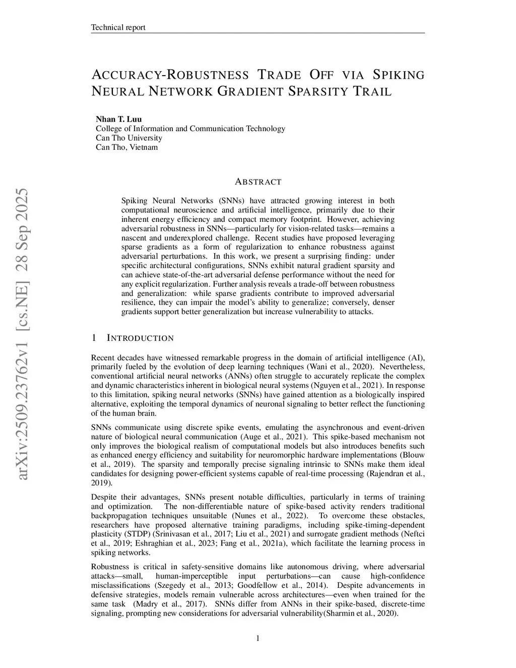Spiking Neural Networks (SNNs) have attracted growing interest in both computational neuroscience and artificial intelligence, primarily due to their inherent energy efficiency and compact memory footprint. However, achieving adversarial robustness in SNNs, particularly for vision-related tasks, remains a nascent and underexplored challenge. Recent studies have proposed leveraging sparse gradients as a form of regularization to enhance robustness against adversarial perturbations. In this work, we present a surprising finding: under specific architectural configurations, SNNs exhibit natural gradient sparsity and can achieve state-of-the-art adversarial defense performance without the need for any explicit regularization. Further analysis reveals a trade-off between robustness and generalization: while sparse gradients contribute to improved adversarial resilience, they can impair the model's ability to generalize; conversely, denser gradients support better generalization but increase vulnerability to attacks.