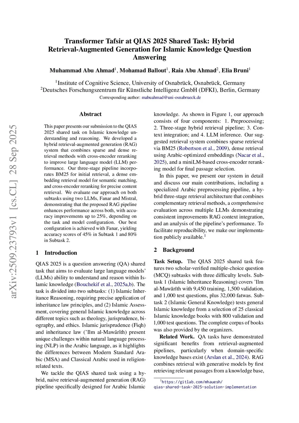 This paper presents our submission to the QIAS 2025 shared task on Islamic knowledge understanding and reasoning. We developed a hybrid retrieval-augmented generation (RAG) system that combines sparse and dense retrieval methods with cross-encoder reranking to improve large language model (LLM) performance. Our three-stage pipeline incorporates BM25 for initial retrieval, a dense embedding retrieval model for semantic matching, and cross-encoder reranking for precise content retrieval. We evaluate our approach on both subtasks using two LLMs, Fanar and Mistral, demonstrating that the proposed RAG pipeline enhances performance across both, with accuracy improvements up to 25%, depending on the task and model configuration. Our best configuration is achieved with Fanar, yielding accuracy scores of 45% in Subtask 1 and 80% in Subtask 2.