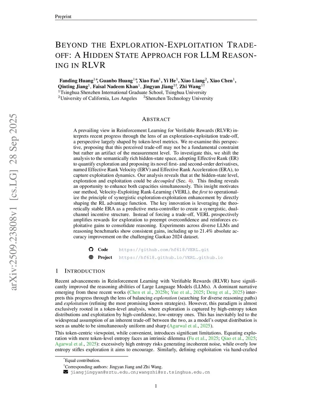 A prevailing view in Reinforcement Learning with Verifiable Rewards (RLVR) interprets recent progress through the lens of an exploration-exploitation trade-off, a perspective largely shaped by token-level metrics. We re-examine this perspective, proposing that this perceived trade-off may not be a fundamental constraint but rather an artifact of the measurement level. To investigate this, we shift the analysis to the semantically rich hidden-state space, adopting Effective Rank (ER) to quantify exploration and proposing its novel first- and second-order derivatives, named ER Velocity and ER Acceleration, to capture exploitation dynamics. Our analysis reveals that in the semantic space, exploration and exploitation could be decoupled (Sec.~4). This finding reveals an opportunity to enhance both capacities simultaneously. This insight motivates our method, Velocity-Exploiting Rank-Learning (VERL), the first to operationalize the principle of synergistic exploration-exploitation enhancement by directly shaping the RL advantage function. The key innovation is leveraging the theoretically stable ERA as a predictive meta-controller to create a synergistic, dual-channel incentive structure. Instead of forcing a trade-off, VERL prospectively amplifies rewards for exploration to preempt overconfidence and reinforces exploitative gains to consolidate reasoning. Experiments across diverse LLMs and reasoning benchmarks show consistent gains, including up to 21.4% absolute accuracy improvement on the challenging Gaokao 2024 dataset.