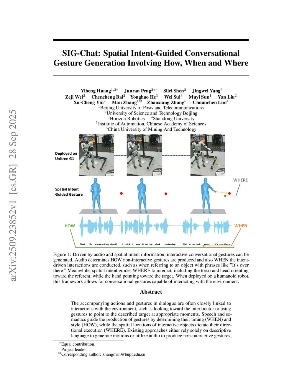 The accompanying actions and gestures in dialogue are often closely linked to interactions with the environment, such as looking toward the interlocutor or using gestures to point to the described target at appropriate moments. Speech and semantics guide the production of gestures by determining their timing (WHEN) and style (HOW), while the spatial locations of interactive objects dictate their directional execution (WHERE). Existing approaches either rely solely on descriptive language to generate motions or utilize audio to produce non-interactive gestures, thereby lacking the characterization of interactive timing and spatial intent. This significantly limits the applicability of conversational gesture generation, whether in robotics or in the fields of game and animation production. To address this gap, we present a full-stack solution. We first established a unique data collection method to simultaneously capture high-precision human motion and spatial intent. We then developed a generation model driven by audio, language, and spatial data, alongside dedicated metrics for evaluating interaction timing and spatial accuracy. Finally, we deployed the solution on a humanoid robot, enabling rich, context-aware physical interactions.