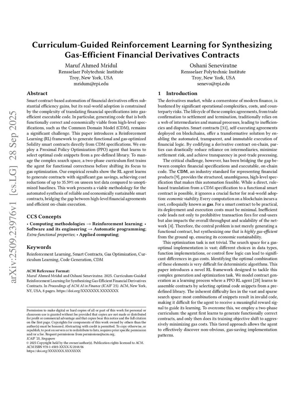 Smart contract-based automation of financial derivatives offers substantial efficiency gains, but its real-world adoption is constrained by the complexity of translating financial specifications into gas-efficient executable code. In particular, generating code that is both functionally correct and economically viable from high-level specifications, such as the Common Domain Model (CDM), remains a significant challenge. This paper introduces a Reinforcement Learning (RL) framework to generate functional and gas-optimized Solidity smart contracts directly from CDM specifications. We employ a Proximal Policy Optimization (PPO) agent that learns to select optimal code snippets from a pre-defined library. To manage the complex search space, a two-phase curriculum first trains the agent for functional correctness before shifting its focus to gas optimization. Our empirical results show the RL agent learns to generate contracts with significant gas savings, achieving cost reductions of up to 35.59% on unseen test data compared to unoptimized baselines. This work presents a viable methodology for the automated synthesis of reliable and economically sustainable smart contracts, bridging the gap between high-level financial agreements and efficient on-chain execution.