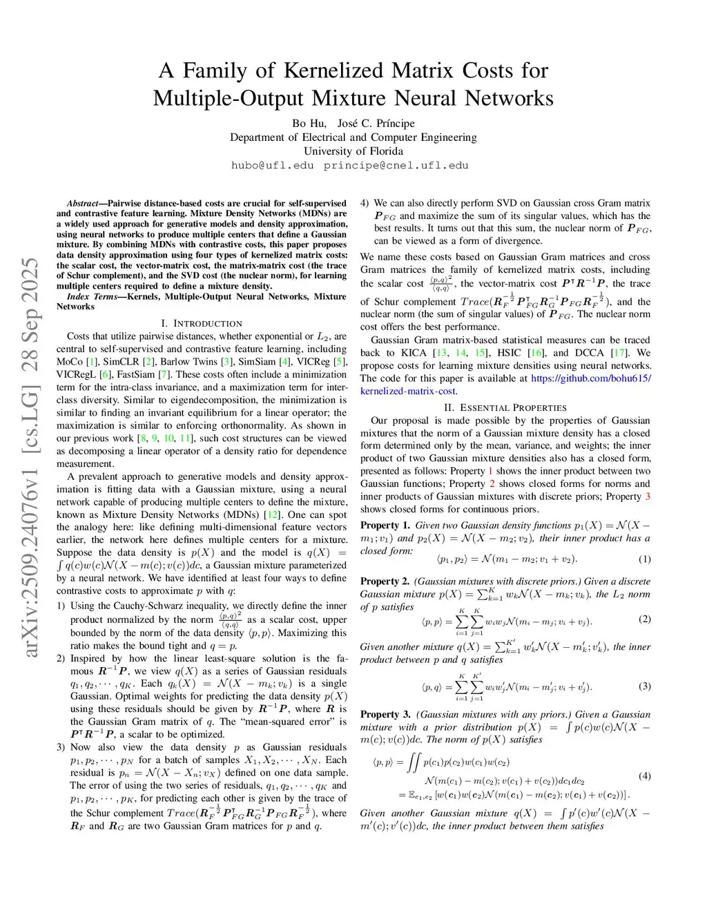 A Family of Kernelized Matrix Costs for Multiple-Output Mixture Neural Networks