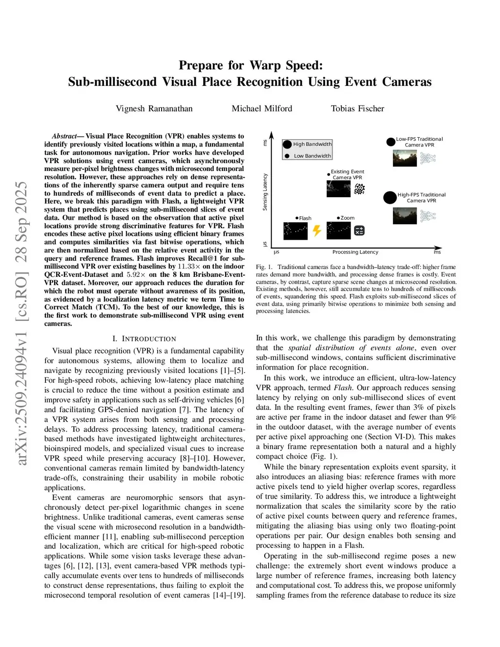 Visual Place Recognition (VPR) enables systems to identify previously visited locations within a map, a fundamental task for autonomous navigation. Prior works have developed VPR solutions using event cameras, which asynchronously measure per-pixel brightness changes with microsecond temporal resolution. However, these approaches rely on dense representations of the inherently sparse camera output and require tens to hundreds of milliseconds of event data to predict a place. Here, we break this paradigm with Flash, a lightweight VPR system that predicts places using sub-millisecond slices of event data. Our method is based on the observation that active pixel locations provide strong discriminative features for VPR. Flash encodes these active pixel locations using efficient binary frames and computes similarities via fast bitwise operations, which are then normalized based on the relative event activity in the query and reference frames. Flash improves Recall@1 for sub-millisecond VPR over existing baselines by 11.33x on the indoor QCR-Event-Dataset and 5.92x on the 8 km Brisbane-Event-VPR dataset. Moreover, our approach reduces the duration for which the robot must operate without awareness of its position, as evidenced by a localization latency metric we term Time to Correct Match (TCM). To the best of our knowledge, this is the first work to demonstrate sub-millisecond VPR using event cameras.