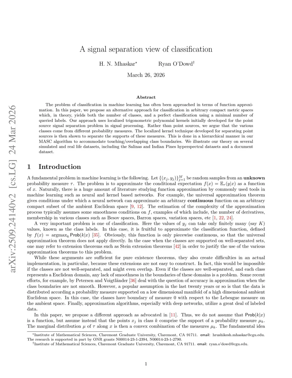 The problem of classification in machine learning has often been approached in terms of function approximation. In this paper, we propose an alternative approach for classification in arbitrary compact metric spaces which, in theory, yields both the number of classes, and a perfect classification using a minimal number of queried labels. Our approach uses localized trigonometric polynomial kernels initially developed for the point source signal separation problem in signal processing. Rather than point sources, we argue that the various classes come from different probability measures. The localized kernel technique developed for separating point sources is then shown to separate the supports of these distributions. This is done in a hierarchical manner in our MASC algorithm to accommodate touching/overlapping class boundaries. We illustrate our theory on several simulated and real life datasets, including the Salinas and Indian Pines hyperspectral datasets and a document dataset.