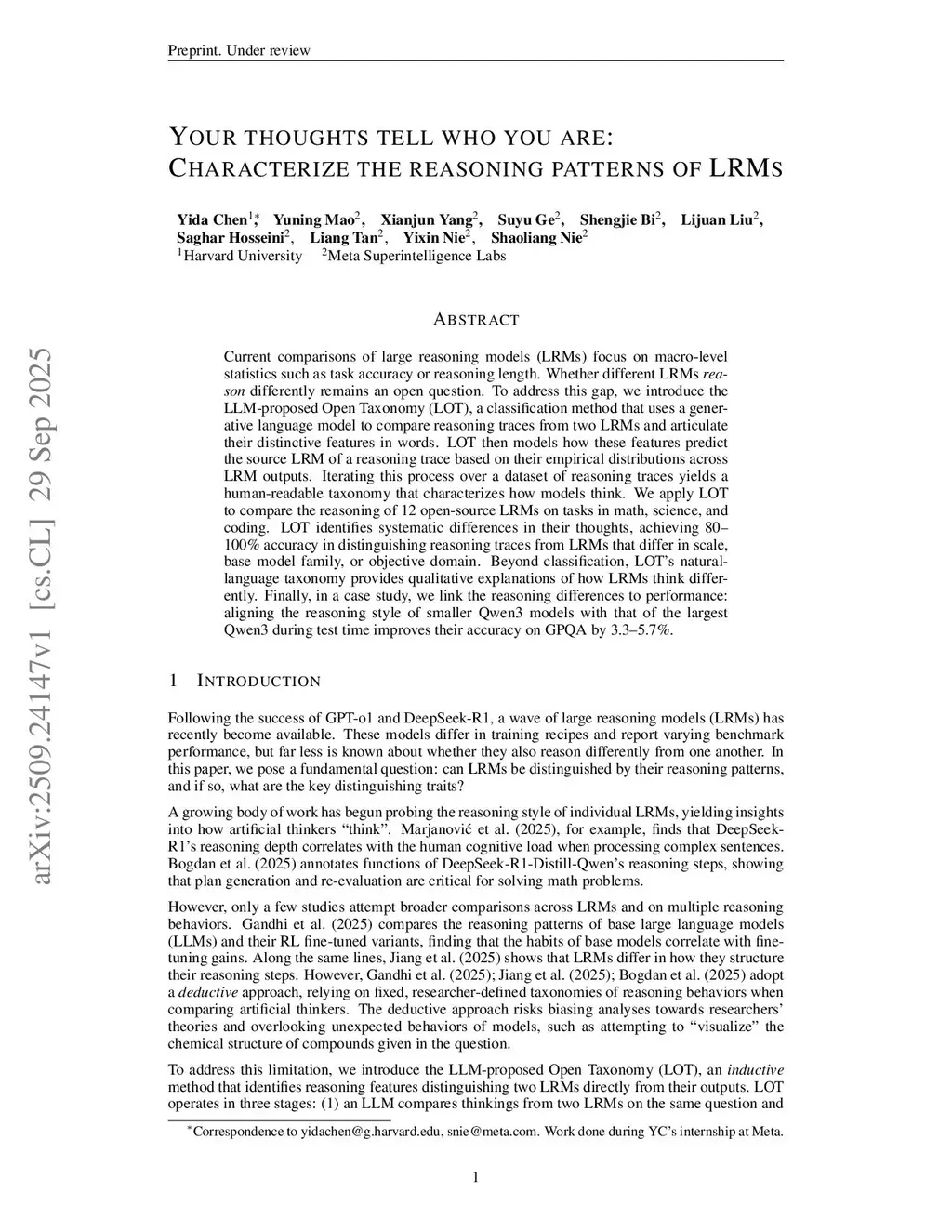 Current comparisons of large reasoning models (LRMs) focus on macro-level statistics such as task accuracy or reasoning length. Whether different LRMs reason differently remains an open question. To address this gap, we introduce the LLM-proposed Open Taxonomy (LOT), a classification method that uses a generative language model to compare reasoning traces from two LRMs and articulate their distinctive features in words. LOT then models how these features predict the source LRM of a reasoning trace based on their empirical distributions across LRM outputs. Iterating this process over a dataset of reasoning traces yields a human-readable taxonomy that characterizes how models think. We apply LOT to compare the reasoning of 12 open-source LRMs on tasks in math, science, and coding. LOT identifies systematic differences in their thoughts, achieving 80-100% accuracy in distinguishing reasoning traces from LRMs that differ in scale, base model family, or objective domain. Beyond classification, LOT's natural-language taxonomy provides qualitative explanations of how LRMs think differently. Finally, in a case study, we link the reasoning differences to performance: aligning the reasoning style of smaller Qwen3 models with that of the largest Qwen3 during test time improves their accuracy on GPQA by 3.3-5.7%.