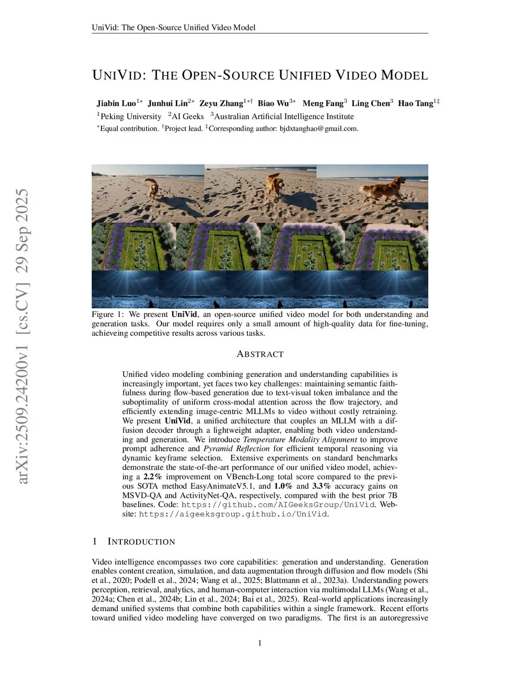 Unified video modeling that combines generation and understanding capabilities is increasingly important but faces two key challenges: maintaining semantic faithfulness during flow-based generation due to text-visual token imbalance and the limitations of uniform cross-modal attention across the flow trajectory, and efficiently extending image-centric MLLMs to video without costly retraining. We present UniVid, a unified architecture that couples an MLLM with a diffusion decoder through a lightweight adapter, enabling both video understanding and generation. We introduce Temperature Modality Alignment to improve prompt adherence and Pyramid Reflection for efficient temporal reasoning via dynamic keyframe selection. Extensive experiments on standard benchmarks demonstrate state-of-the-art performance, achieving a 2.2% improvement on VBench-Long total score compared to EasyAnimateV5.1, and 1.0% and 3.3% accuracy gains on MSVD-QA and ActivityNet-QA, respectively, compared with the best prior 7B baselines. Code:this https URL. Website:this https URL.
