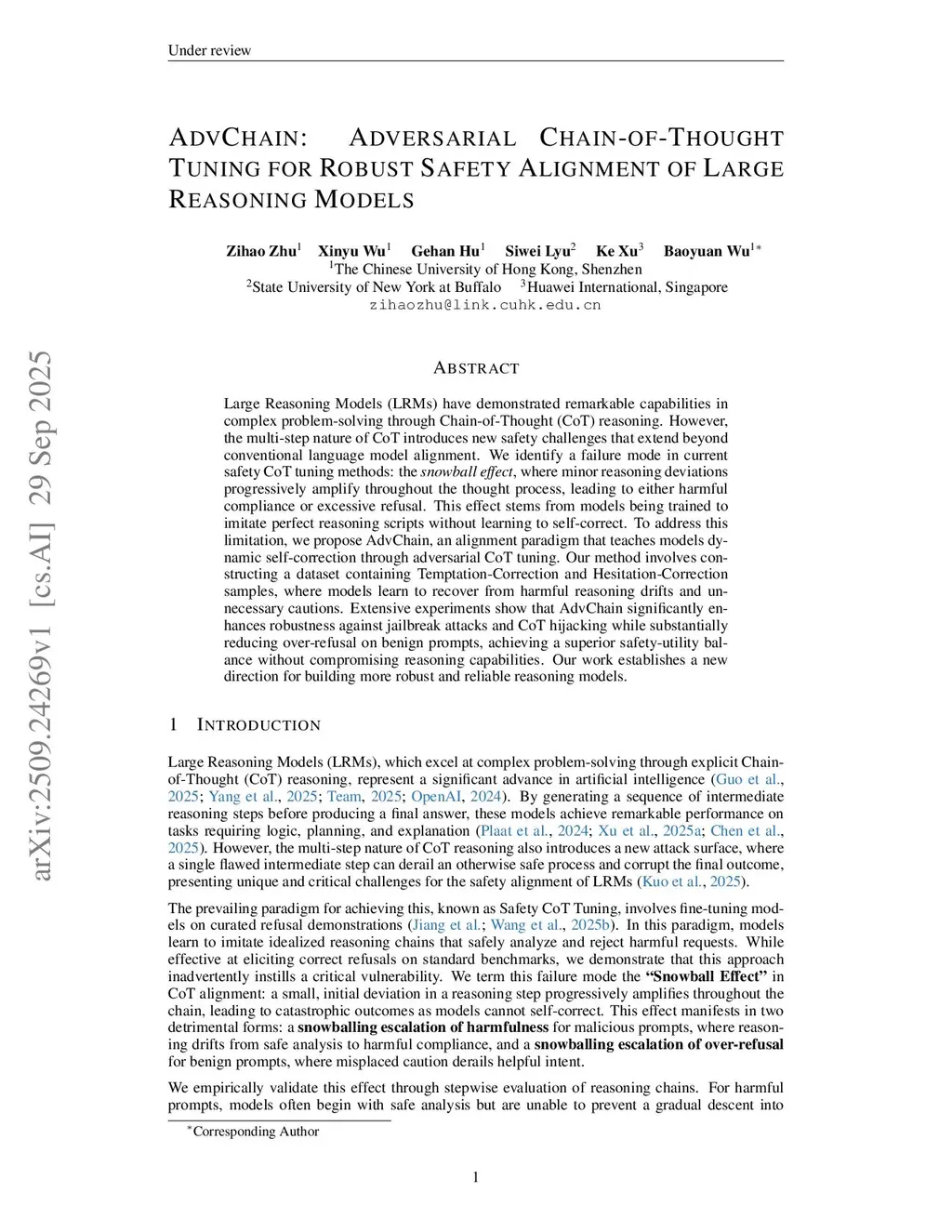 Large Reasoning Models (LRMs) have demonstrated remarkable capabilities in complex problem-solving through Chain-of-Thought (CoT) reasoning. However, the multi-step nature of CoT introduces new safety challenges that extend beyond conventional language model alignment. We identify a failure mode in current safety CoT tuning methods: the \textit{snowball effect}, where minor reasoning deviations progressively amplify throughout the thought process, leading to either harmful compliance or excessive refusal. This effect stems from models being trained to imitate perfect reasoning scripts without learning to self-correct. To address this limitation, we propose AdvChain, an alignment paradigm that teaches models dynamic self-correction through adversarial CoT tuning. Our method involves constructing a dataset containing Temptation-Correction and Hesitation-Correction samples, where models learn to recover from harmful reasoning drifts and unnecessary cautions. Extensive experiments show that AdvChain significantly enhances robustness against jailbreak attacks and CoT hijacking while substantially reducing over-refusal on benign prompts, achieving a superior safety-utility balance without compromising reasoning capabilities. Our work establishes a new direction for building more robust and reliable reasoning models.