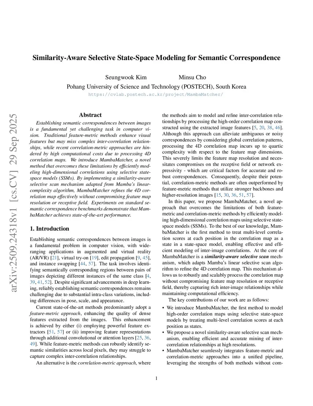 Establishing semantic correspondences between images is a fundamental yet challenging task in computer vision. Traditional feature-metric methods enhance visual features but may miss complex inter-correlation relationships, while recent correlation-metric approaches are hindered by high computational costs due to processing 4D correlation maps. We introduce MambaMatcher, a novel method that overcomes these limitations by efficiently modeling high-dimensional correlations using selective state-space models (SSMs). By implementing a similarity-aware selective scan mechanism adapted from Mamba's linear-complexity algorithm, MambaMatcher refines the 4D correlation map effectively without compromising feature map resolution or receptive field. Experiments on standard semantic correspondence benchmarks demonstrate that MambaMatcher achieves state-of-the-art performance.