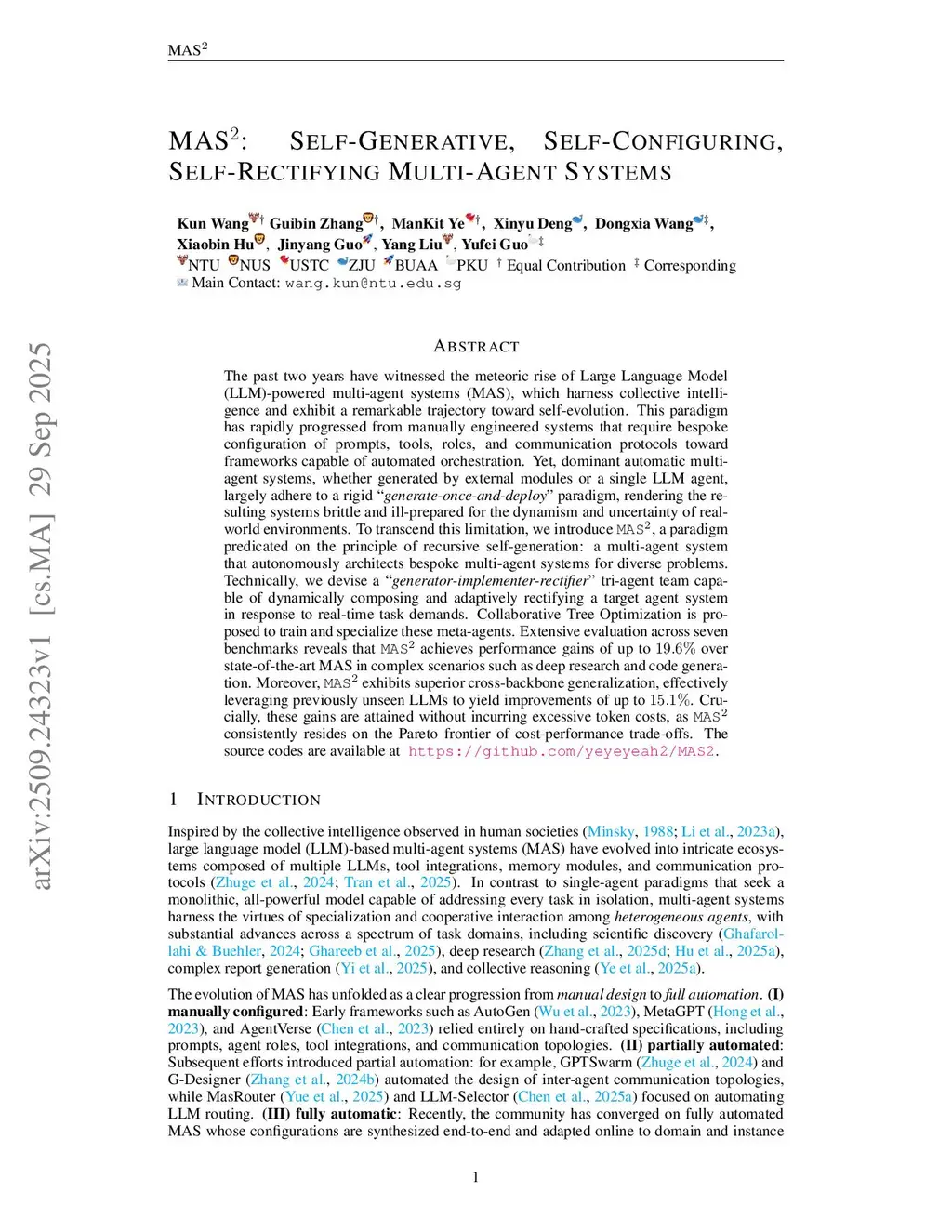 MAS: Self-Generative, Self-Configuring, Self-Rectifying Multi-Agent Systems
